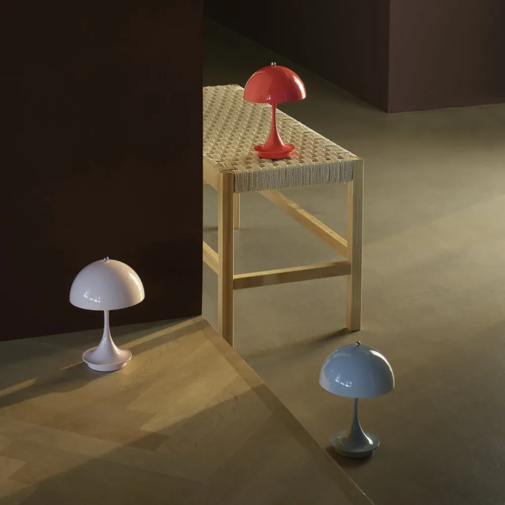 Den batteridrevne LED-bordlampe Panthella Portable 160 i 3. version er fremstillet af sprøjtestøbt, genanvendt polymer. Den er udstyret med en touch-kontakt på den øverste møtrik, hvorved den kan tændes og slukkes og indstilles i tre lysstyrkeniveauer. Designet af Panthella-lampen er et af Verner Pantons mest betydningsfulde designs og afspejler den danske arkitekts store personlighed. Han ønskede at designe en organisk formet lampe, der leverer 100 % blændfrit lys, hvor stativet og skærmen fungerer som lysreflektorer. Panton udviklede Panthella-lampen i 1971 i samarbejde med Louis Poulsen. Lampens karakteristiske form og dens evne til at reflektere et blødt lys fra sin trompetformede fod har givet den status som en designikon. Panthella 160 Portable-lampen er en mindre version af det oprindelige design. Den er perfekt til at tage med fra rum til rum eller ud på altanen eller i haven. Den ser fantastisk ud overalt og skaber en vidunderlig atmosfære.