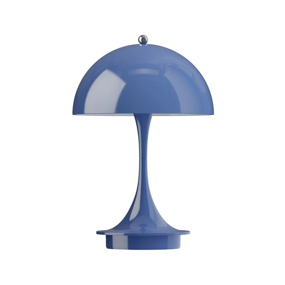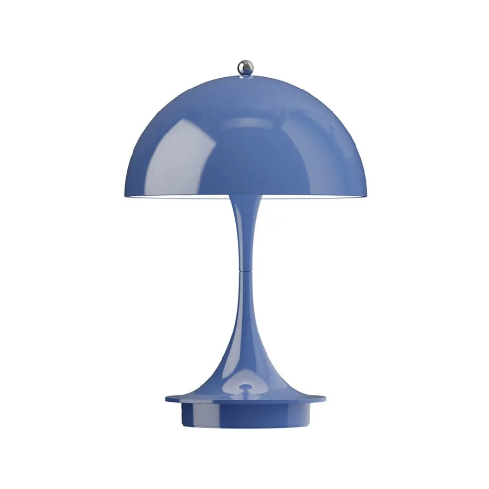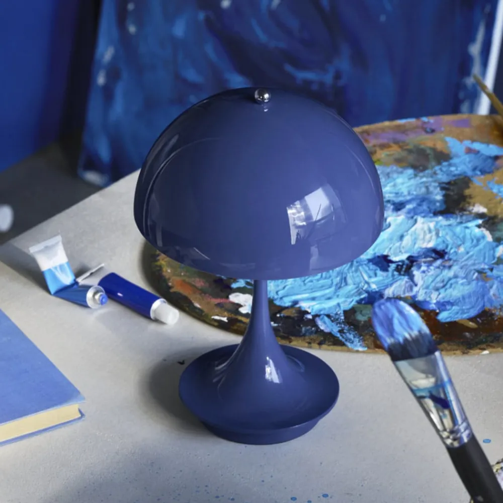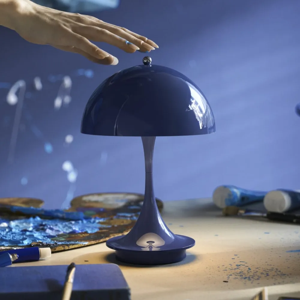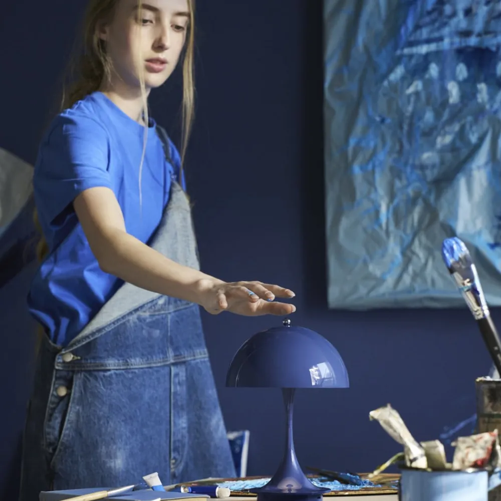 Den batteridrevne LED-bordlampe Panthella Portable 160 i 3. version er fremstillet af sprøjtestøbt, genanvendt polymer. Den er udstyret med en touch-kontakt på den øverste møtrik, hvorved den kan tændes og slukkes og indstilles i tre lysstyrkeniveauer. Designet af Panthella-lampen er et af Verner Pantons mest betydningsfulde designs og afspejler den danske arkitekts store personlighed. Han ønskede at designe en organisk formet lampe, der leverer 100 % blændfrit lys, hvor stativet og skærmen fungerer som lysreflektorer. Panton udviklede Panthella-lampen i 1971 i samarbejde med Louis Poulsen. Lampens karakteristiske form og dens evne til at reflektere et blødt lys fra sin trompetformede fod har givet den status som en designikon. Panthella 160 Portable-lampen er en mindre version af det oprindelige design. Den er perfekt til at tage med fra rum til rum eller ud på altanen eller i haven. Den ser fantastisk ud overalt og skaber en vidunderlig atmosfære.