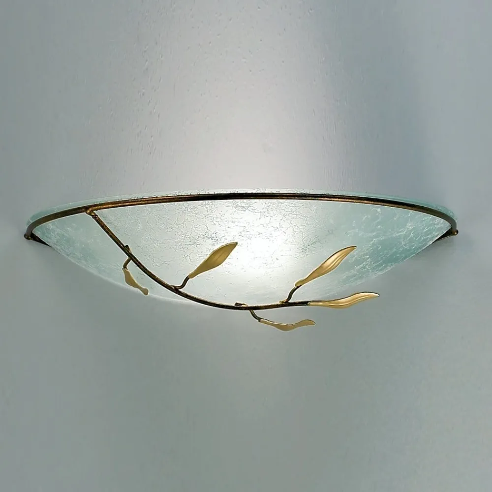 Dekorativ Luca væglampe med scavo-glas for hyggeligt lys Med denne væglampe er mindre mere – en enkelt gren med blade i antik guldfinish løber langs den elegante halvskål i scavo-glas. Det giver Luca et klassisk til elegant rustikt præg, som passer til mange indretningsstile. Lyset spotlightes indirekte opad og blidt ud i omgivelserne gennem glasset. Det betyder, at intet står i vejen for en stemningsfuld atmosfære.