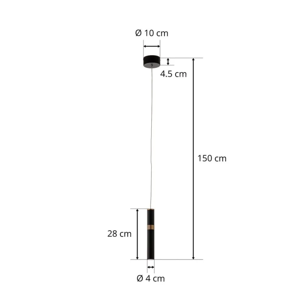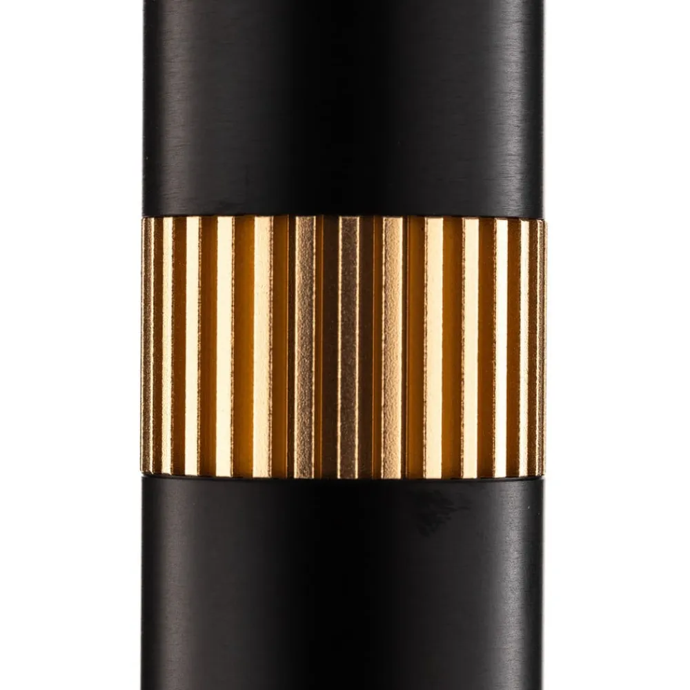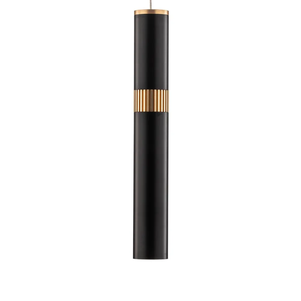 Rund, smal LED-pendellampe Bjarko med en ædel rørform og sort finish med messingdetaljerBjarko er en LED-pendellampe, der inspirerer med et enkelt og ædelt design. Den er meget smalt formet og rund og ligner en cylinder. Overfladen er hovedsageligt sort, men i den øverste del er der også en ring i messing, som fuldender designet og skaber en blød, men effektiv kontrast. Den rillede struktur på dette element ser meget elegant og individuel ud. Lyset er hovedsageligt rettet nedad, og derfor er LED pendelarmaturet meget velegnet til belysning af borde og diske. En smal trådophængning fuldender det yndefulde og sofistikerede look og fører til baldakinen, som er monteret i loftet.