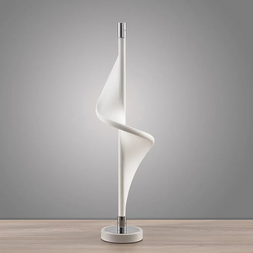 Edano LED-bordlampe i et særligt design, stepdim-funktion Edano LED-bordlampen af aluminium og hvidt stof har et unikt og usædvanligt design. Skærmen ligner et flagrende banner, der bevæger sig i vinden. Den snor sig rundt om aluminiumsrammen, som er monteret på en rund fod af forkromet aluminium. Varmhvide LED’er fremhæver på imponerende vis hele strukturen, som er en smuk dekoration i ethvert rum, selv når den er slukket, og henleder opmærksomheden på denne kunstnerisk designede lampe, når den er tændt, hvilket gør den særligt velegnet til moderne omgivelser. 3-trins dæmpbar + slukket: Kontakten gør det muligt at tænde og slukke for lyset som normalt. Takket være 3-trins-dæmpningsteknologien med integreret slukfunktion kan den også dæmmes til tre forskellige lysstyrkeniveauer ved at trykke på kontakten flere gange: 100 %, 50 % og 10 %.