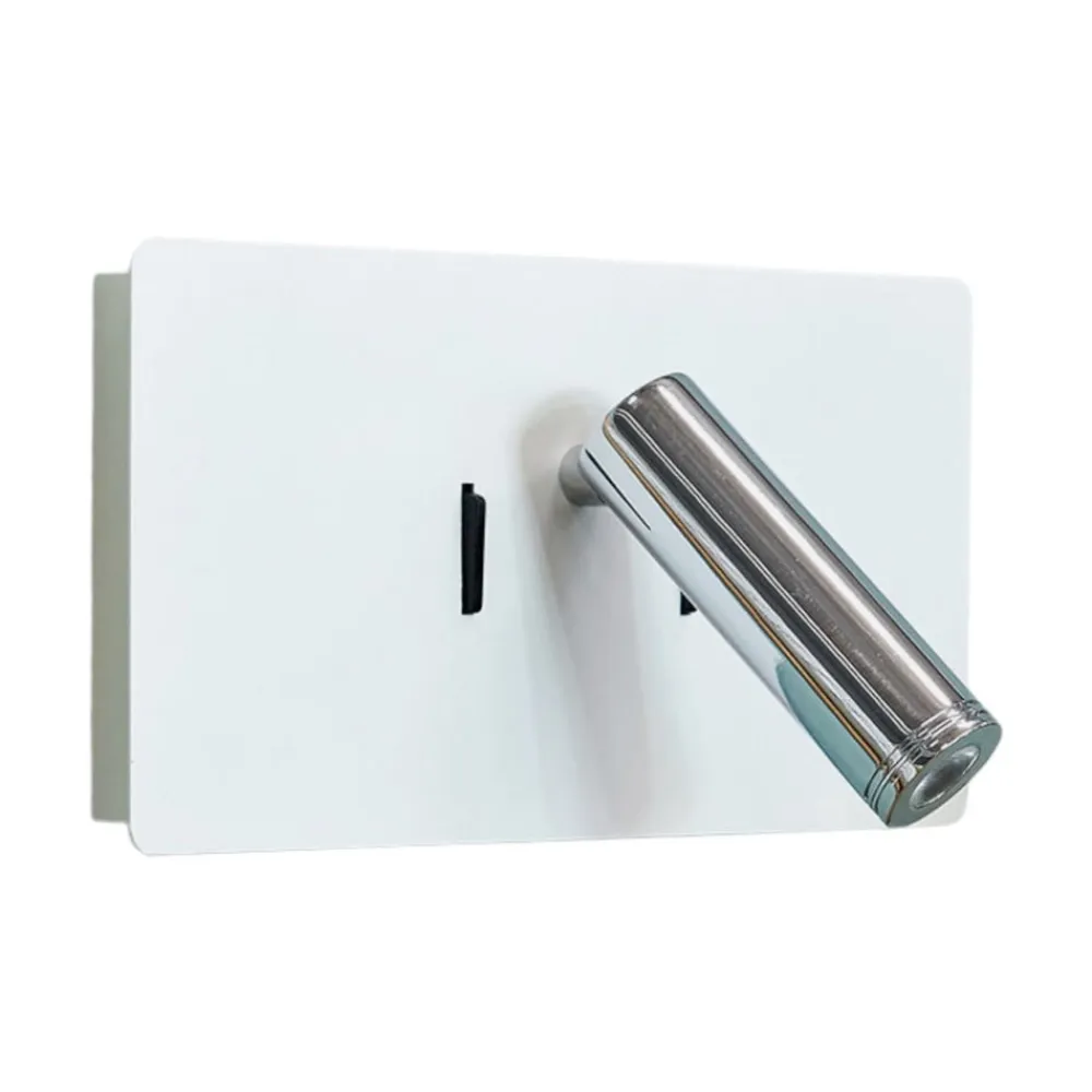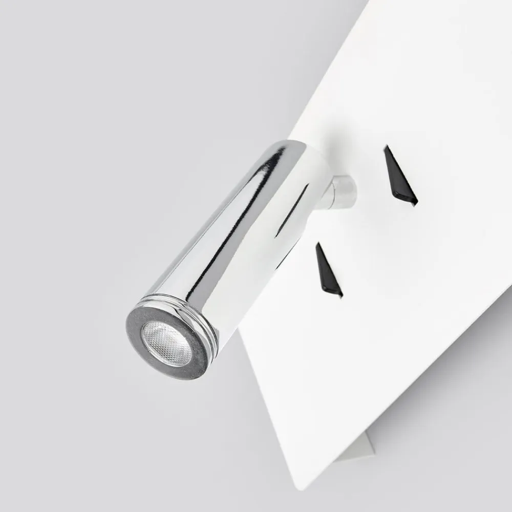 Hvid LED-væglampe Elske – en kombination af målrettet læselampe og hyggeligt lys med blændfri effekt Elske er perfekt til montering i nærheden af en seng eller sofa. Omgivelsesbelysningen har en særlig hyggelig effekt, fordi LED-lyskilderne er placeret bag metalafskærmningen og ikke er direkte synlige, hvilket skaber et behageligt, blændfrit lys, der indbyder til afslapning. Læselampen derimod, som har form af en slank, cylindrisk, forkromet stang, der kan drejes efter behov, giver et direkte og præcist lys, der er ideelt til læsning, og som aflaster øjnene, når man tager en bog eller et magasin op. De to lyskilder kan betjenes separat ved hjælp af to lettilgængelige kontakter.
