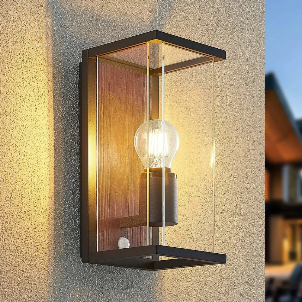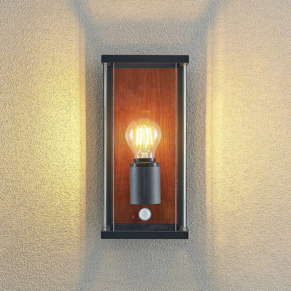 Sensor udendørs væglampe Elwin med element i trædekor og glasindsatser på siderne