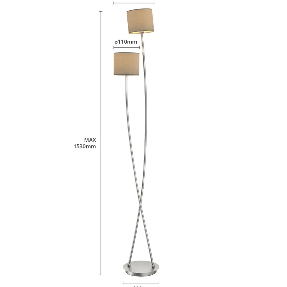 Juljana har et metalstel, der er præget af særligt fine, svungne linjer, så der opstår et let, legende design. De to stænger, der fører til skærmene, krydser hinanden og er smukt buede, mens overfladen er mat satineret og forstærker den elegante generelle udstråling. De runde stofskærme er holdt i en attraktiv farvenuance, der virker jordagtig og forener lyse grå, cremefarvede og brune nuancer. Det får lysets design til at virke varmt og hyggeligt, og dette udtryk forstærkes naturligvis når lyskilderne tændes. Så bades stuen nemlig i et helt speciel hyggestemning og standerlampen kan dermed anvendes optimalt som en nuanceret aftenbelysning. Lampens look er dog også præget af et tidløst element, så man kan bruge den i forskellige stilarter i indretningen og i flere forskellige rum.