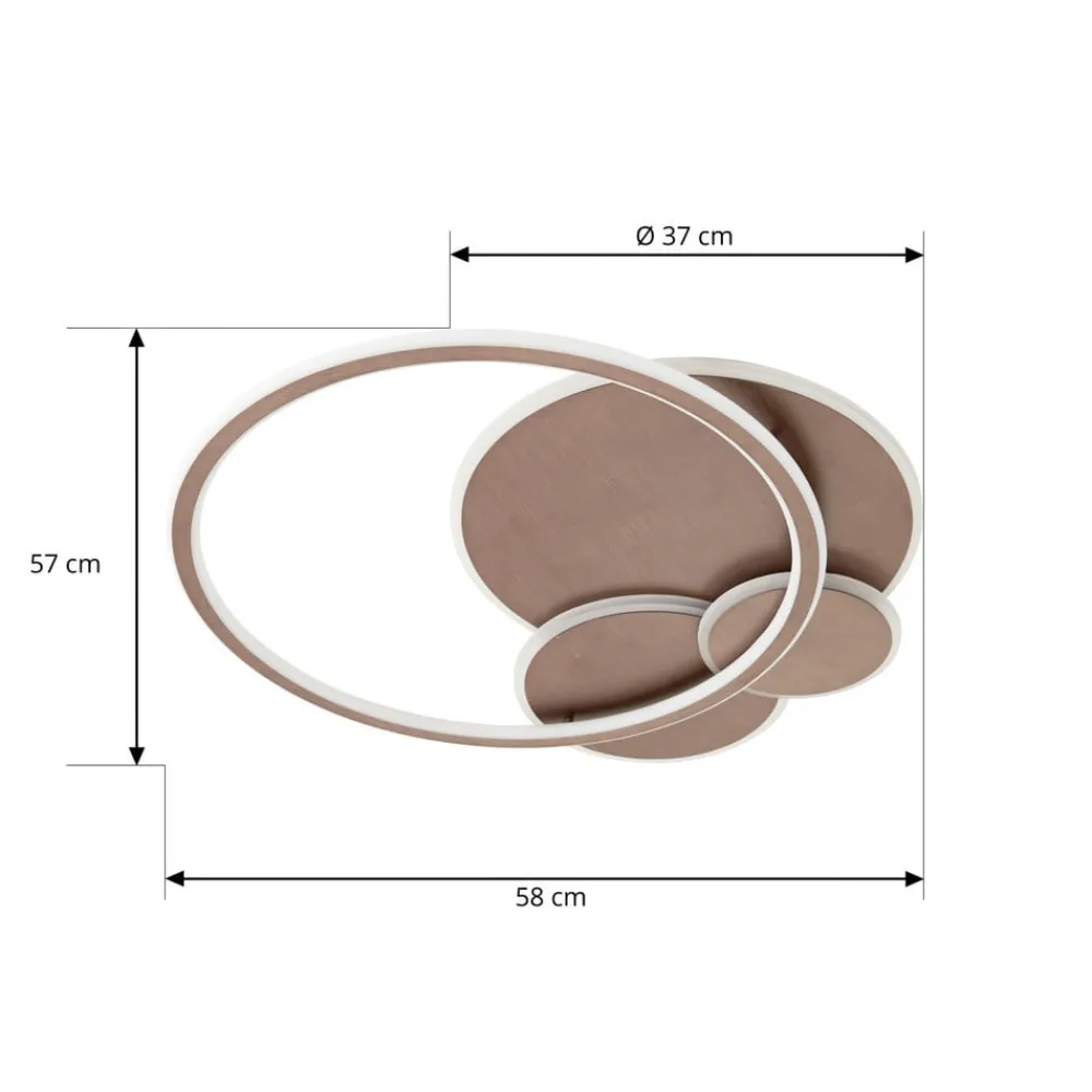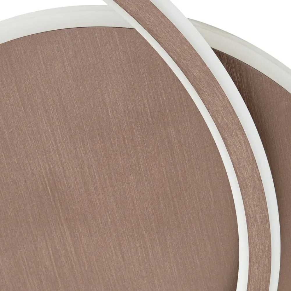 LED-loftslampe Circulo i kaffebrun forener moderne design med funktionel alsidighed. Den er fremstillet af metal og har en imponerende farvegengivelse på 90 Ra, der bader ethvert rum i et harmonisk lys. Med den integrerede CCT-funktion kan lysfarve indstilles i 3 trin mellem varmhvid (2.7000 K) og universalhvid (3.800 K + 5.000 K) for at imødekomme individuelle behov. De fastmonterede LED’er sikrer en energieffektiv belysning, der kommer til sin ret både i stuen, spisestuen og gangen.