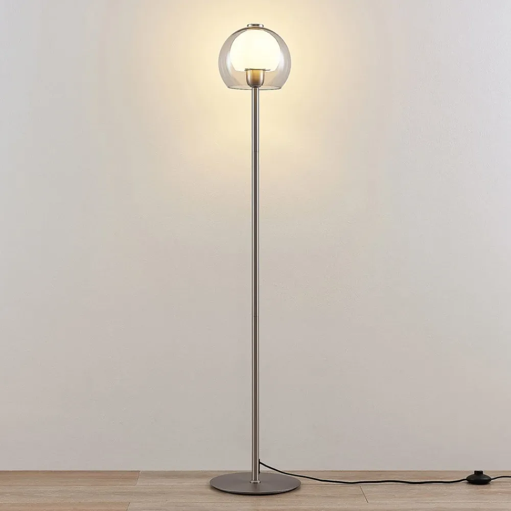 Slank Kaiya gulvlampe af nikkelfarvet jern med lampeskærm af glas Kaiya er den perfekte ledsager til at læse en bog i sofaen om aftenen. Den slanke gulvlampe er lavet af jern og består af en rund base og et slankt ben med en moderne nikkelfarvet overflade. Øverst sidder en lampeskærm af to halvkugler i glas, som skaber en attraktiv farvekontrast med sin hvide og røggrå farve. Kaiya gulvlampe kan udstyres med passende pærer og nemt tændes og slukkes ved hjælp af en kabelafbryder. Dens elegante udseende smelter ubesværet sammen med resten af møblerne uden at overskygge dem.