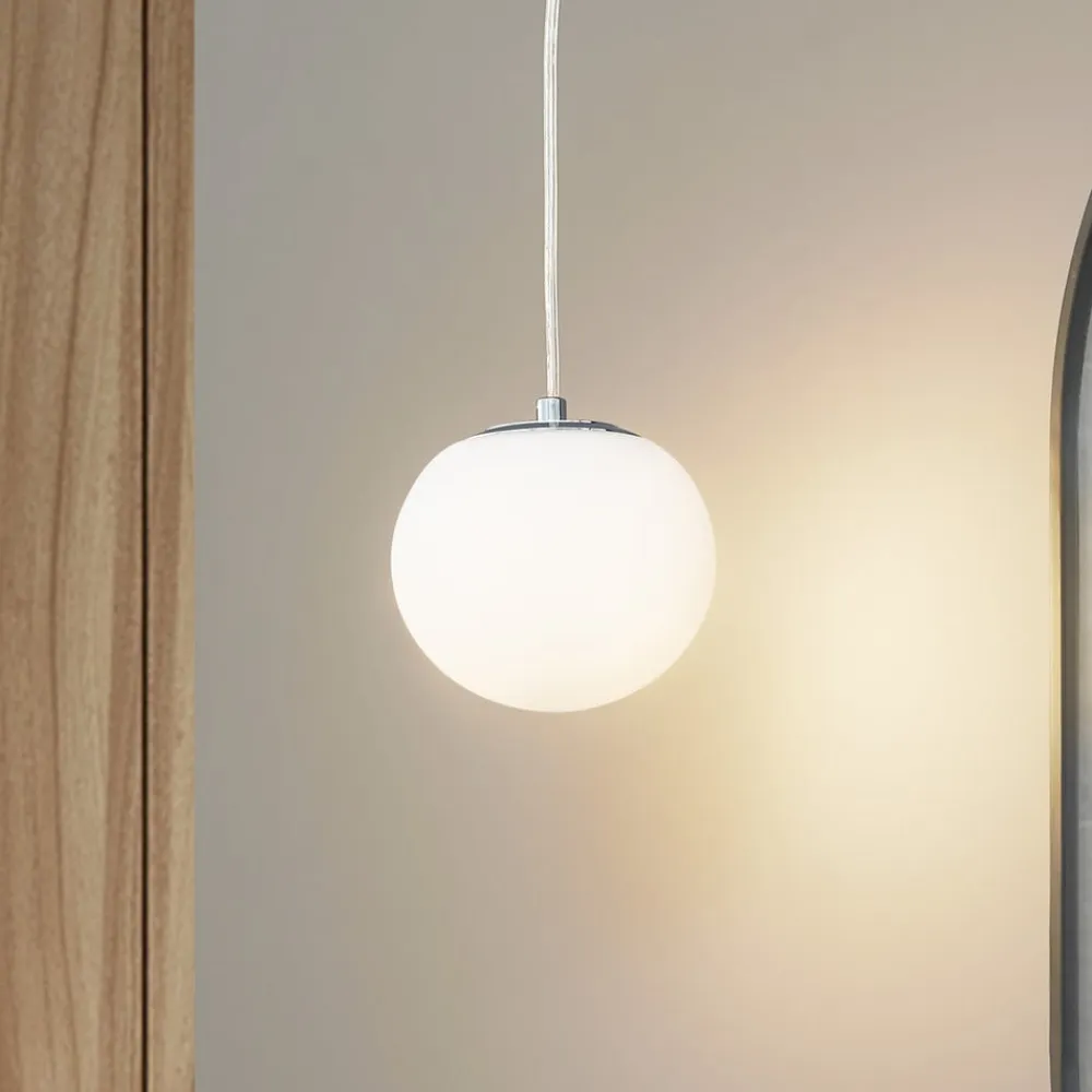 Sfærisk glaspendel Bidolo til badeværelset Bidolo-pendlen er et ægte blikfang på badeværelset – denne lampe skaber en behagelig atmosfære. Den kan dæmpes ved hjælp af en ekstern lysdæmper, som ikke medfølger. Beskyttelsesgraden er tilstrækkelig til brug på badeværelset (IP44). Med sit tidløse design og høje kvalitet er pendlen en god investering. Lad dig fortrylle af dens fascinerende lys!