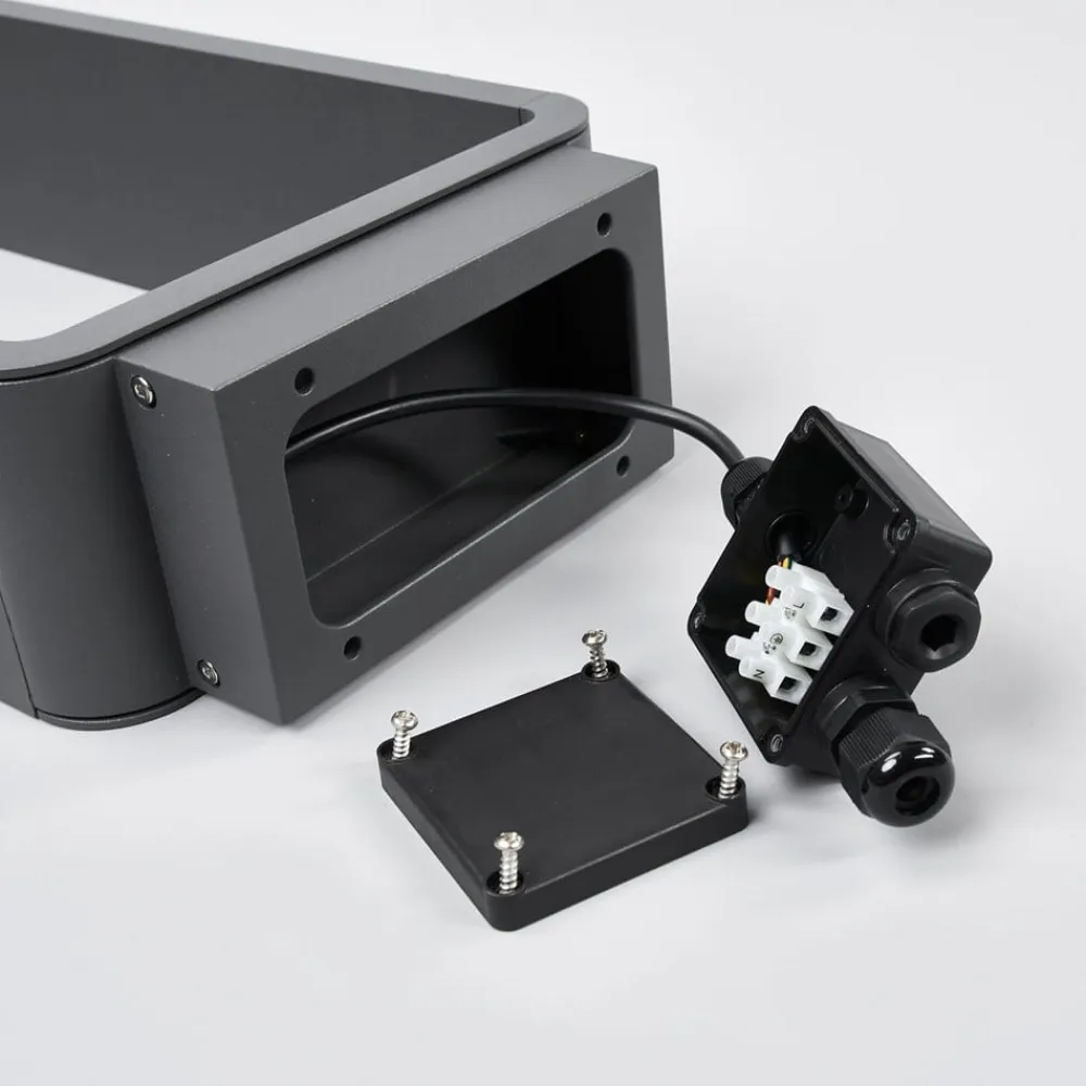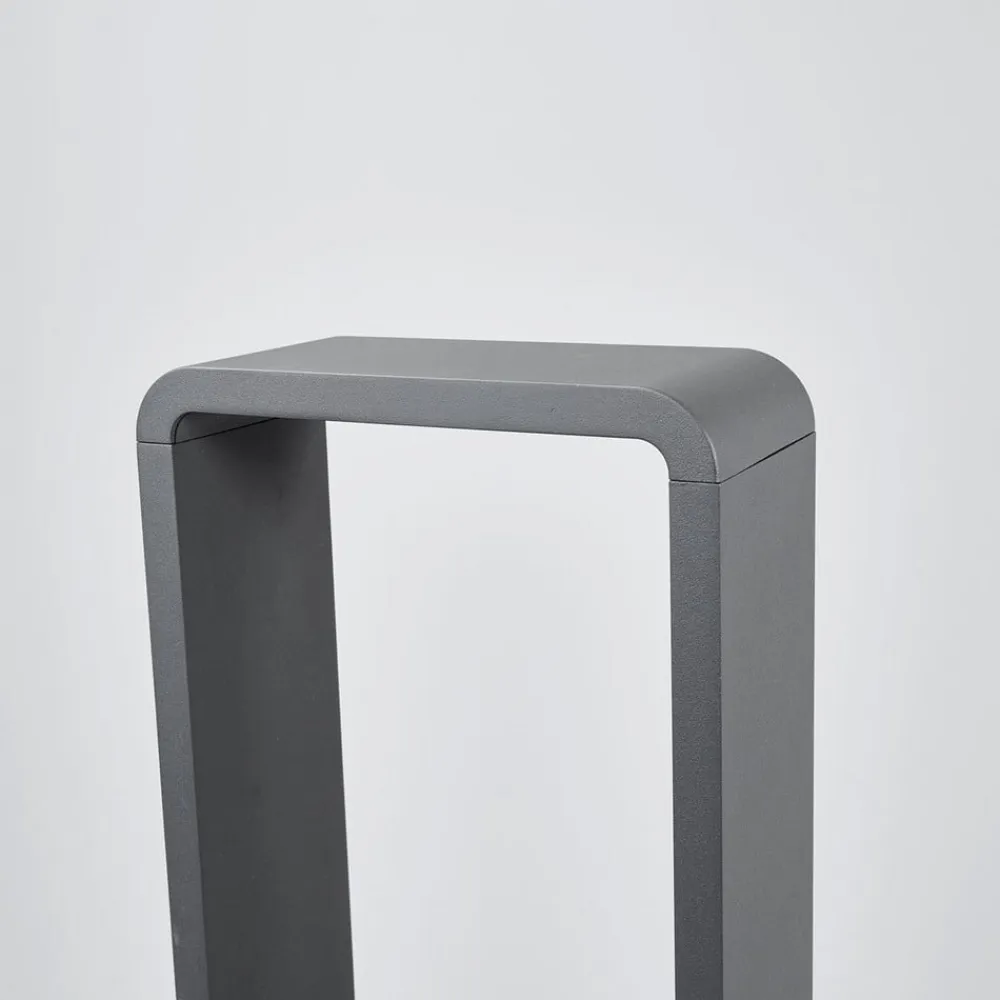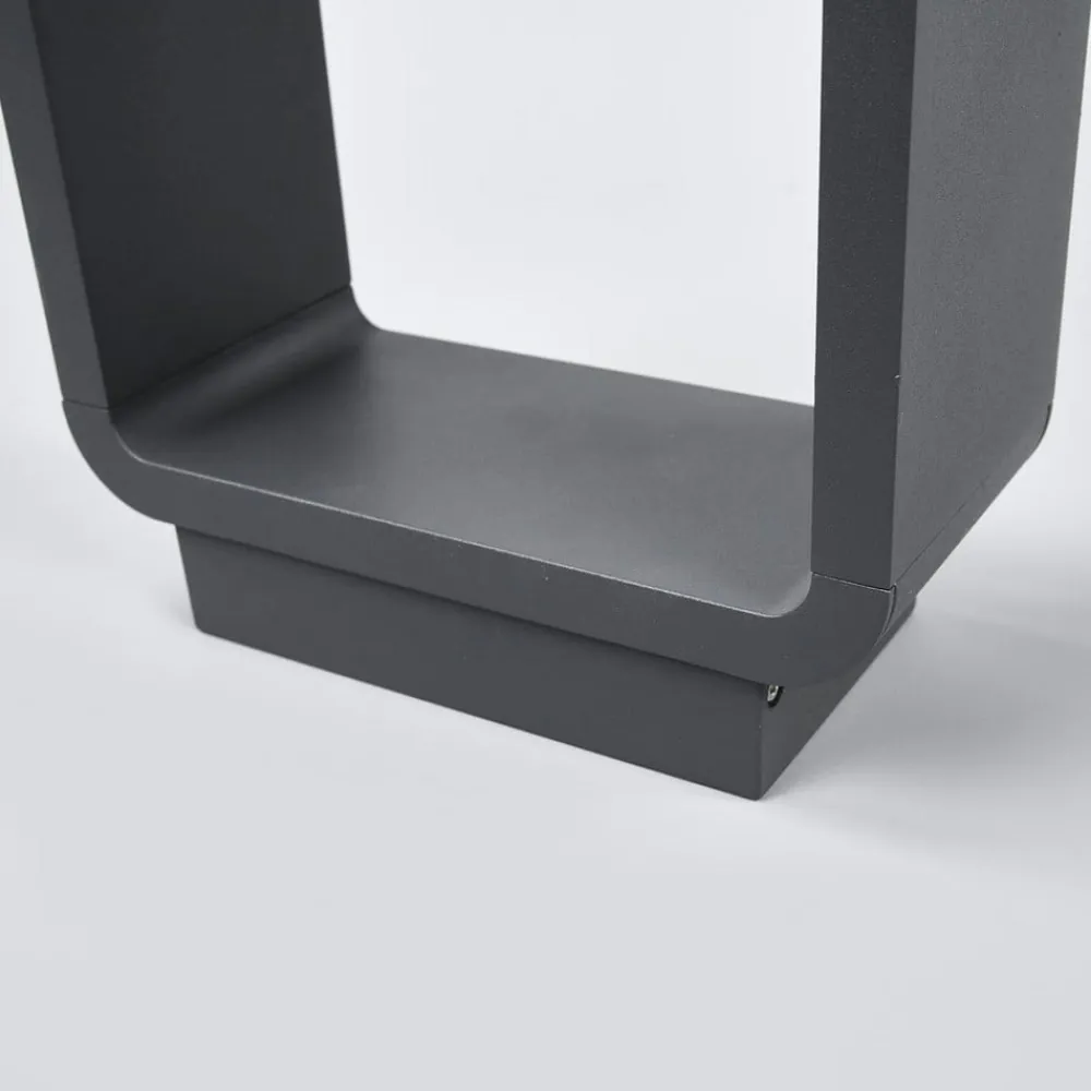 Mørkegrå LED-vejlampe Ninon af indrammet trykstøbt aluminium Ninon har integrerede LED’er, der er placeret i den øverste del af vejlampen, og hvis lys er rettet nedad, hvilket skaber en meget behagelig lyseffekt. Lyset er stort set blændfrit, og når Ninon LED-gadelampen er installeret, giver den et behageligt orienteringslys, så man føler sig tryg og guidet, når man går gennem haven eller gårdspladsen. Det indrammede design med afrundede hjørner er særligt iøjnefaldende og passer rigtig godt til moderne arkitektur.