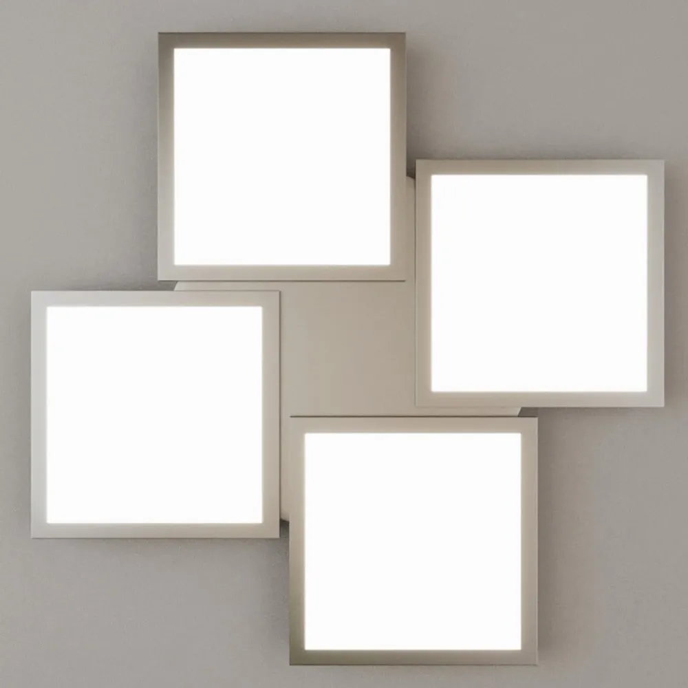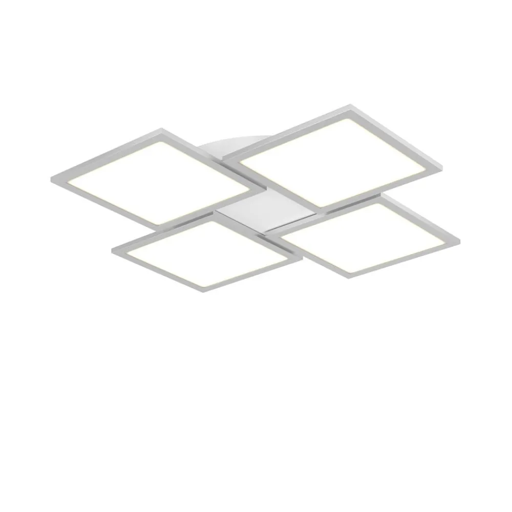 Ilira 4-lyskilder LED-loftlampe med oplyste firkanter, justerbar lysfarve og lysstyrke Denne LED-loftlampe er kendetegnet ved en bred vifte af funktioner og leveres med en medfølgende fjernbetjening. Den har forskellige formål og kan bruges til at tænde og slukke og til at dæmpe lysstyrken (trinløst eller i 15 niveauer). Der er også en hukommelsesfunktion, så de valgte indstillinger ikke går tabt, selv om der slukkes, og Ilira kan betjenes i natlystilstand eller med en timer på 15 minutter. Det er også muligt at indstille farvetemperaturen i tre trin. Denne funktion kan aktiveres via vægkontakten. Loftlampen er visuelt imponerende med sin sammensætning af fire firkantede lysende overflader. Dette sikrer også en høj lysstyrke og gør Ilira ideel til stemningsbelysning i et rum. Tekniske data: – Lysfarve kan indstilles i tre trin i forskellige hvide nuancer (via kontakt) – Lysstyrke kan indstilles i 15 trin eller kontinuerligt (via fjernbetjening) – Hukommelsesfunktion – Natlysfunktion – 15-minutters timer – Fjernbetjening