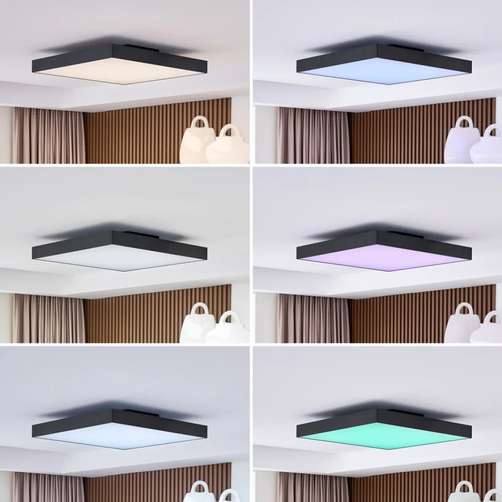 Leicy loftlampe med RGB-farvegradient – kan styres med den medfølgende fjernbetjening Denne smukt designede loftlampe oplyser dine fire vægge perfekt. Lampen har en smuk stil og passer effektivt ind i dit rum. Den kan nemt tændes og slukkes med fjernbetjeningen og kan dæmmes med fjernbetjeningen, så du kan justere lysstyrken efter eget ønske. Lysfarven kan vælges fleksibelt, så den passer til dit humør. Denne loftlampe kombinerer alle de kvaliteter og særlige funktioner, der kendetegner Lucande-mærket. Lyset skaber en smuk atmosfære og er særligt effektivt i dit rum. Den sorte lampe vil glæde dig og kan integreres harmonisk i en lang række forskellige boligstile. Den giver ikke kun et smukt lys, men har også en dekorativ funktion – inkl. fjernbetjening – RGBIC-funktion – CCT-funktion (3.000 – 6.500 K)