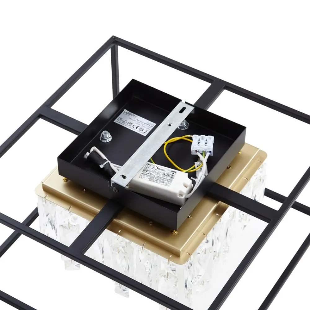 Dæmpbar LED-loftslampe Kassi i krystal-look Den kantede LED-loftslampe Kassi imponerer med sin elegante farvekombination af guld, sort og de klare, glitrende plastkrystaller, som er omgivet af en diskret ramme. Det giver loftslampen en unik atmosfære i ethvert boligområde. Med en farvetemperatur på 3.000 K giver den et behageligt og hyggeligt lys. Den integrerede LED-lyskilde er ikke kun særlig holdbar, men også energieffektiv, og lysstyrken kan justeres i tre trin ved hjælp af en almindelig vægkontakt for at skabe det rigtige lys til enhver tid. Den stilfulde krystalskærm giver lampen et strejf af elegance og gør den til et blikfang i ethvert rum. Ikke mindst fordi de reflekterende egenskaber skaber en spændende lysoplevelse.