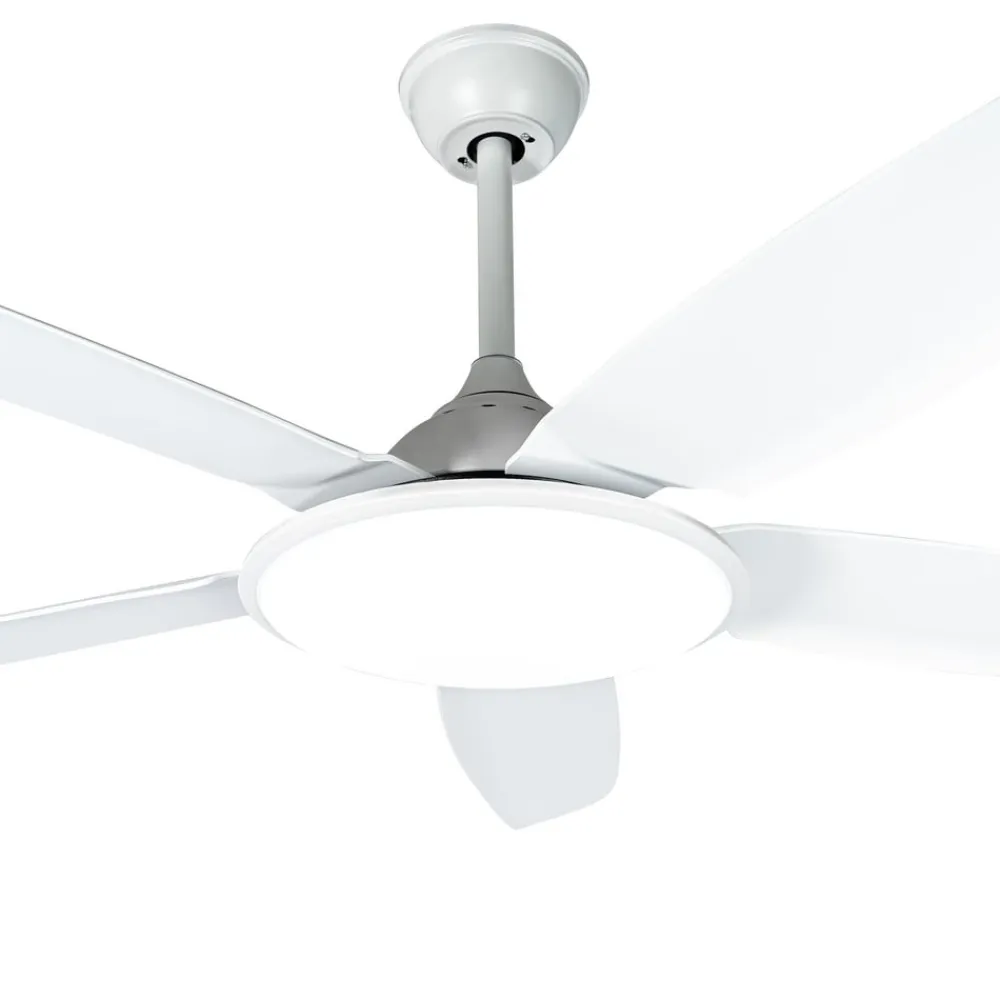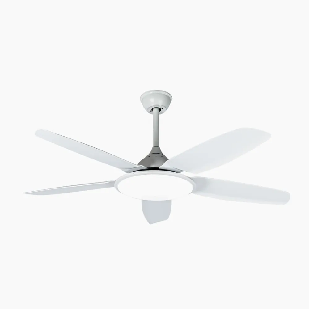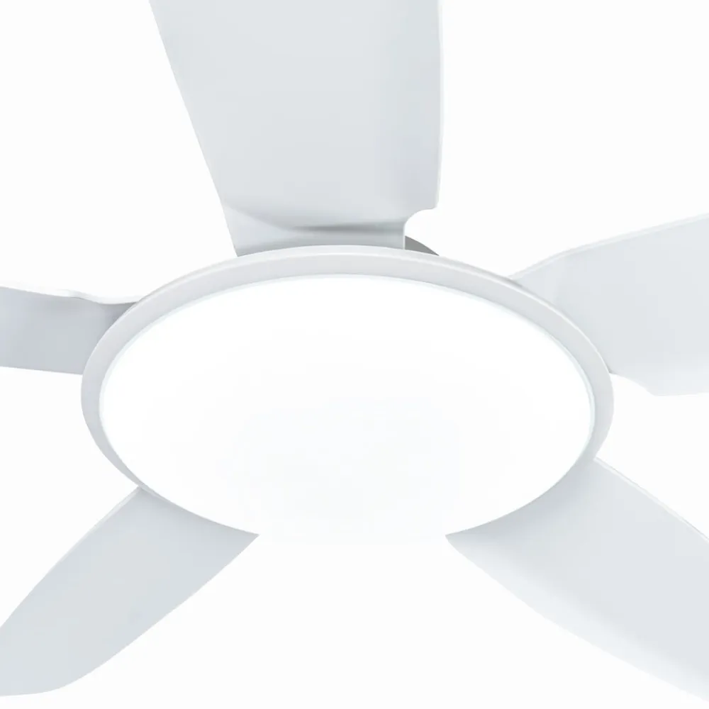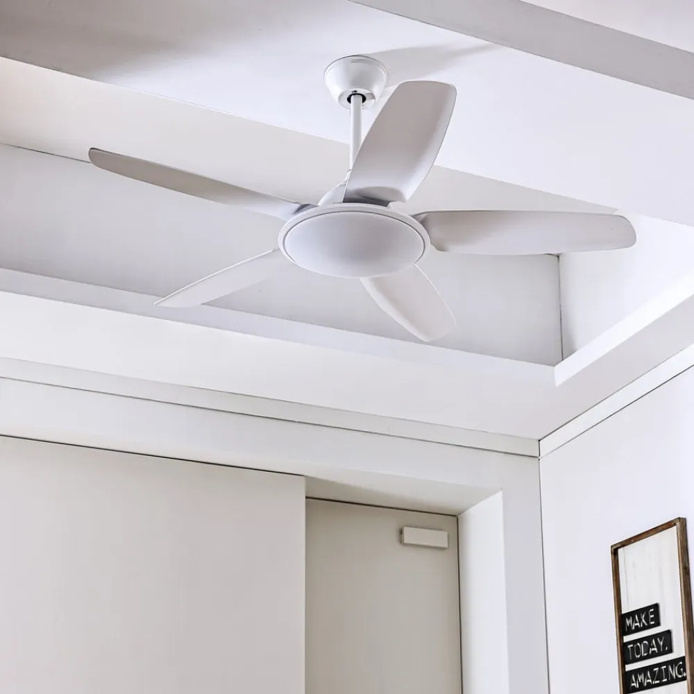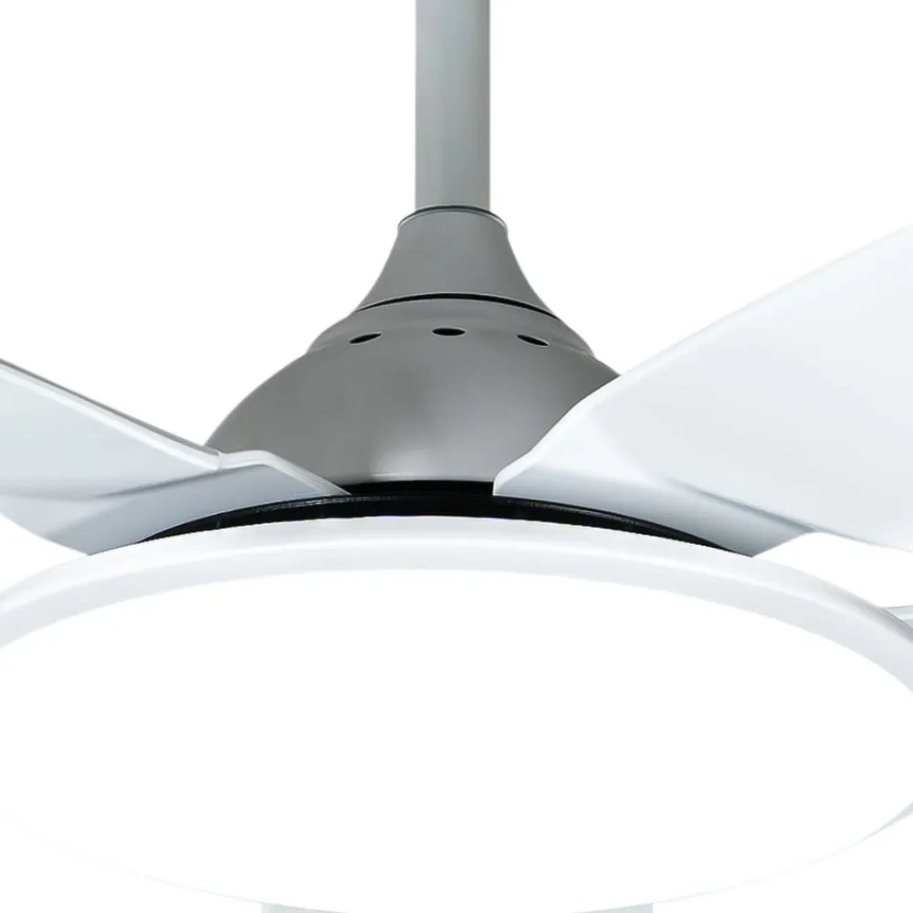 Enkel Divian LED-loftventilator med kontrollerbar lysfarve Divian LED-loftventilatoren fås i en lys, helt hvid version. Takket være det neutrale farveskema kan den integreres i forskellige farvekoncepter og er velegnet til rumstørrelser på op til 18 m². Divian har et robust jernhus og i alt fem plastblade. Et lyst LED-modul er skjult under et rundt akryldæksel. Funktioner Denne LED-loftventilator leveres med en fjernbetjening, der giver dig mulighed for at vælge mellem fem hastighedsniveauer og sommer- eller vintertilstand. Farvetemperaturen på det integrerede LED-modul kan også styres i tre trin: 3.000 K, 4.000 K. 6.500 K. Driftstiden kan også indstilles i trin (1 time, 4 timer, 8 timer) ved hjælp af timerfunktionen.