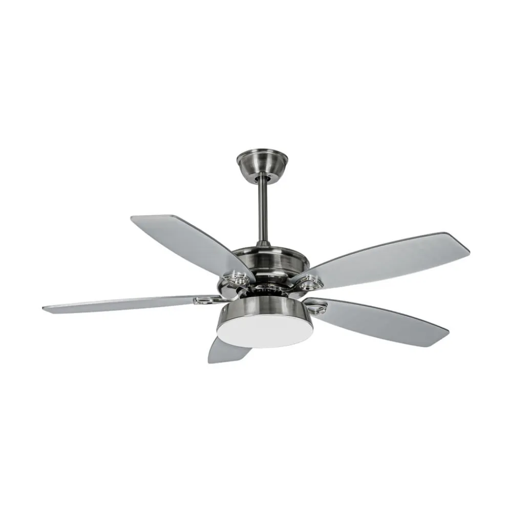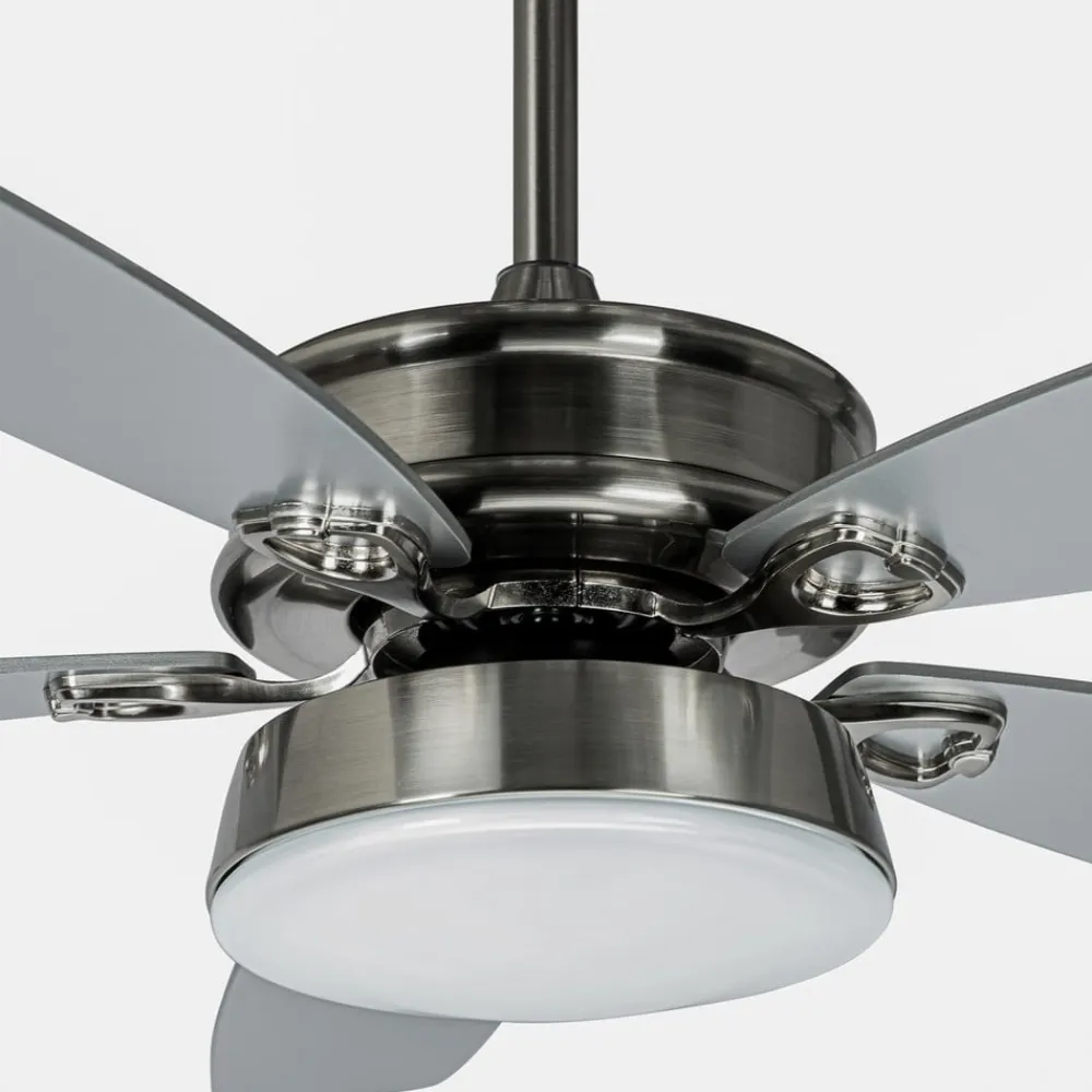 Kuvio fembladet LED-loftventilator med styrbar lysfarve og timerfunktion Med sine fem blade af sølvfarvet krydsfiner sikrer Kuvio LED-loftventilatoren en optimal luftfordeling, især i rum på op til 15 m². Dens jernhus er udført i neutral nikkel, hvilket betyder, at den harmonerer godt med forskellige farveskemaer. Funktioner Denne ventilator giver en frisk brise om sommeren med sin frem- og tilbageløbsstrøm, og om vinteren flytter den den varme luft, der stiger opad, tilbage nedad og fordeler den jævnt i hele rummet. Den medfølgende fjernbetjening har mange funktioner, som viser sig at være meget praktiske i hverdagen. Timerfunktionen giver brugeren mulighed for at beslutte, om ventilatoren skal slukkes manuelt eller automatisk efter 1, 4 eller 8 timers drift. Desuden kan hastigheden reguleres i fem trin og farvetemperaturen i tre trin: 3.000 K, 4.000 K. 6.500 K. Tekniske data Effekt: 38/24/14/9/5 watt Hastighed: 245/208/171/136/101 o/min Maksimal volumenstrøm (Q): 156,12 m³/min Serviceværdi (SV): 3,93 (m³/min)/W (IEC60879:1986) Strømforbrug i standby (PSB): 0,4 W Ventilatorens lydeffektniveau (LW): 53,8 dB (A) Maksimal lufthastighed (c): 2,529 meter/sek