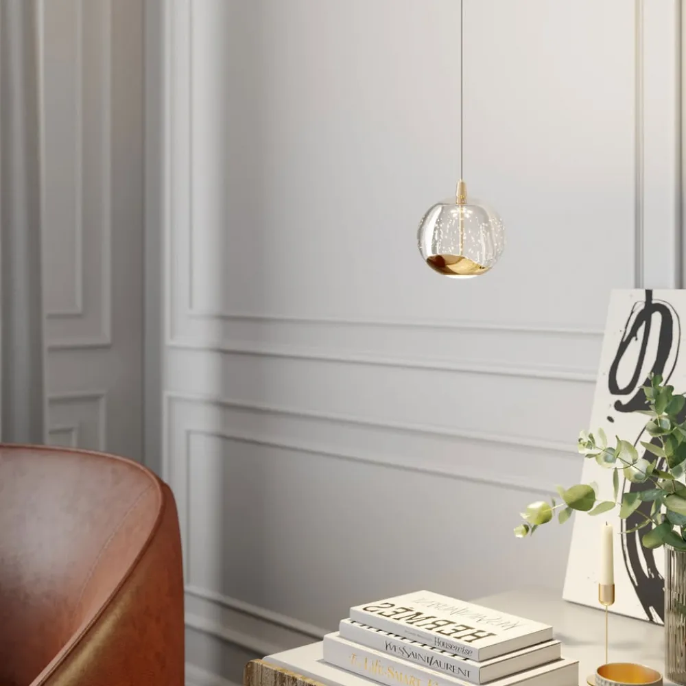 Sfærisk LED-hængelampe Hayley med guldfarvede elementer og en glasskærm med boblestruktur Hayley har et slående udseende og er en kompakt LED-hængelampe, der kan bruges i en række stuer, hvor den bliver et dekorativt blikfang. Du kan også bruge flere lamper på række, f.eks. til at oplyse en disk. LED’erne er både effektive og energibesparende, hvilket giver en god lysstyrke med et lavt strømforbrug. Glaskuglen har en interessant overflade med boblestruktur, og på undersiden er der et metalelement, der ligesom loftbeslaget er udført i en skinnende guldtone, hvilket giver pendellampen et klassisk look. Lysudsendelsen er ikke kun direkte, men også indirekte, hvor den direkte lyskomponent fremstår så blød og hyggelig som muligt takket være et hvidt glaselement.