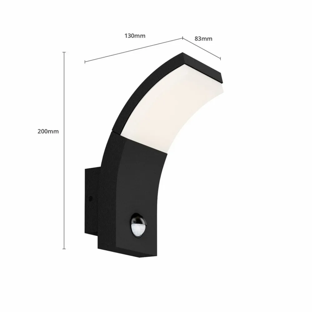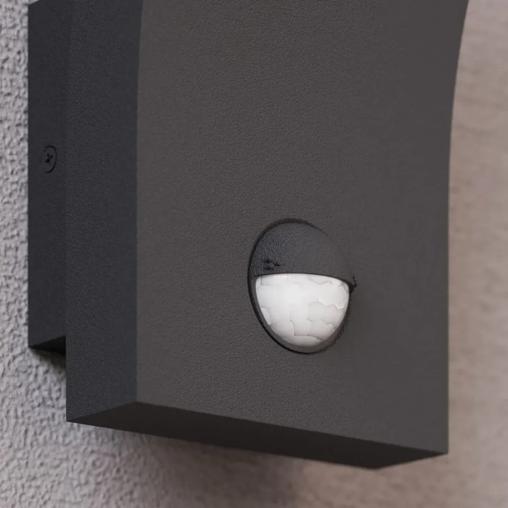 Udendørs LED-væglampe Timm med bevægelsessensor Den udendørs LED-væglampe Timm er lavet af letvægtsaluminium i grafitgrå. Der er et beslag på den nederste del af lysrammen, som kan bruges til at montere lampen på en væg. Formen på Timm-armaturet er let buet, så det varmhvide lys fra LED’erne sendes nedad. Den udendørs LED-væglampe kan belyse udendørsarealer godt, så det bliver lettere at genkende snublefarer, og er også udstyret med en praktisk bevægelsessensor. Denne har en registreringsvinkel på 120° og en maksimal rækkevidde på 9 meter. Lysets varighed kan indstilles fra 5 sekunder til 8 minutter.