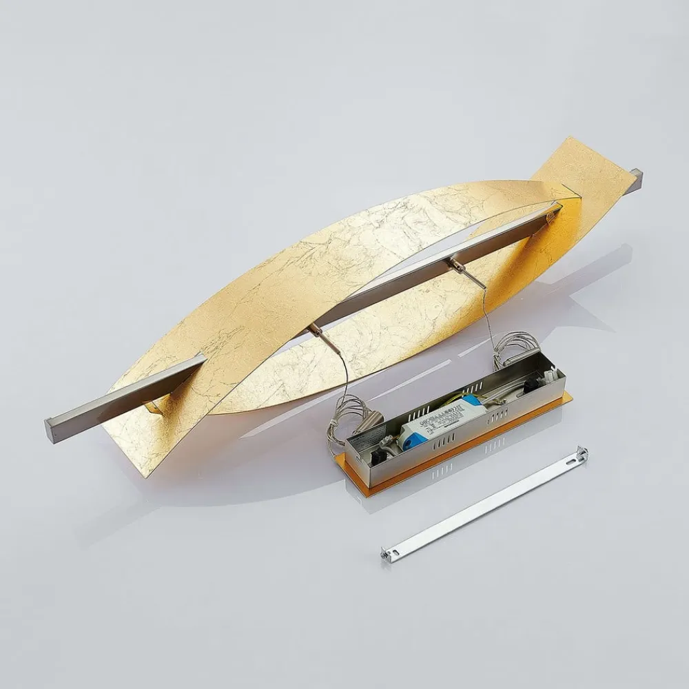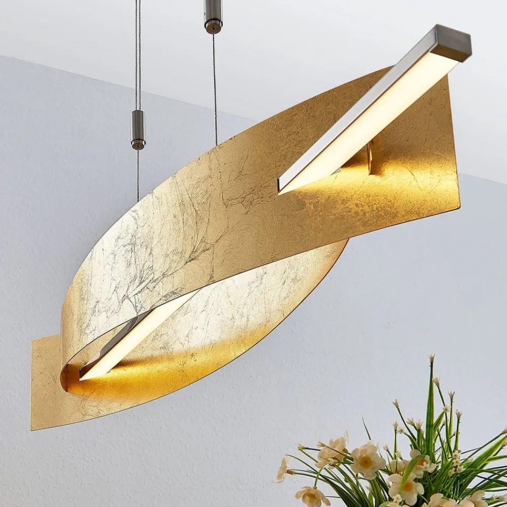 Med skærme i guldlook: den dæmpbare LED-hængelampe Marija er et blikfang Denne moderne hængelampe kombinerer to blikfang: to buede skærme i guld og den bedste LED-teknologi. Metalskærmene er forbundet med et lyselement i sølv, hvilket skaber en bevidst farvekontrast. Marija hængelampen har også et guldfarvet ophæng i en rektangulær form, som de to guidekabler er fastgjort til. Marija LED-hængelampen kan monteres i forskellige højder, så den hyggelige belysning fremhæves perfekt i ethvert rum. En integreret lysdæmperfunktion giver dig også frihed til at justere lysintensiteten i tre trin, så den passer til dine individuelle behov.