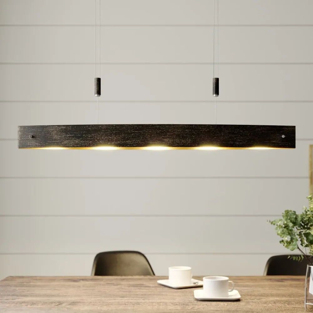 Lio udmærker sig gennem dens varme hvide lys, der udstråler en hjemlig hygge. Denne LED-hængelampe kan monteres over et spisebord, hvor den vil komme til god anvendelse. En anden fordel er at den kan justeres i højden, dermed kan Lio nemt ændres i højden fra 110 cm til 200 cm, hvormed den perfekte belysning af spisepladsen opnås. Den indvendige del af skærmen, der består af to lange metalbuer, er belagt med en varm guldfinish, hvormed der udsendes et hyggelig lysskær. På ydersiden er den moderne skærm lakeret sort, og derefter tilføjet en børstet guldfinish, som skaber et individuelt udtryk.