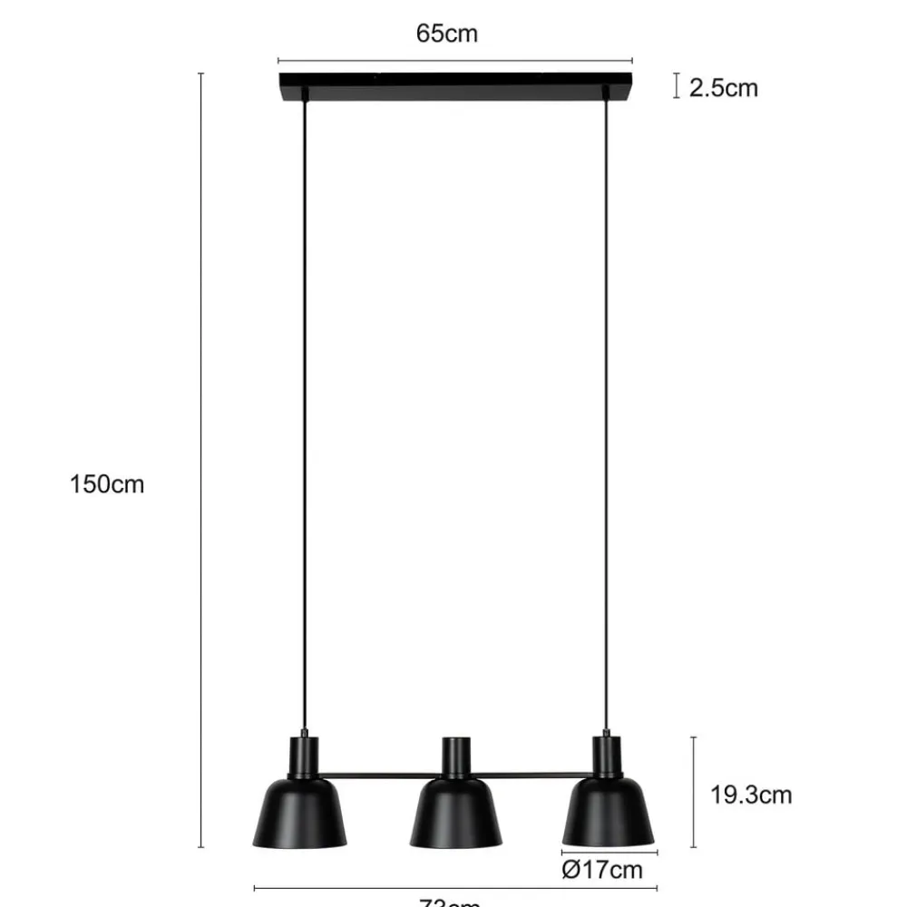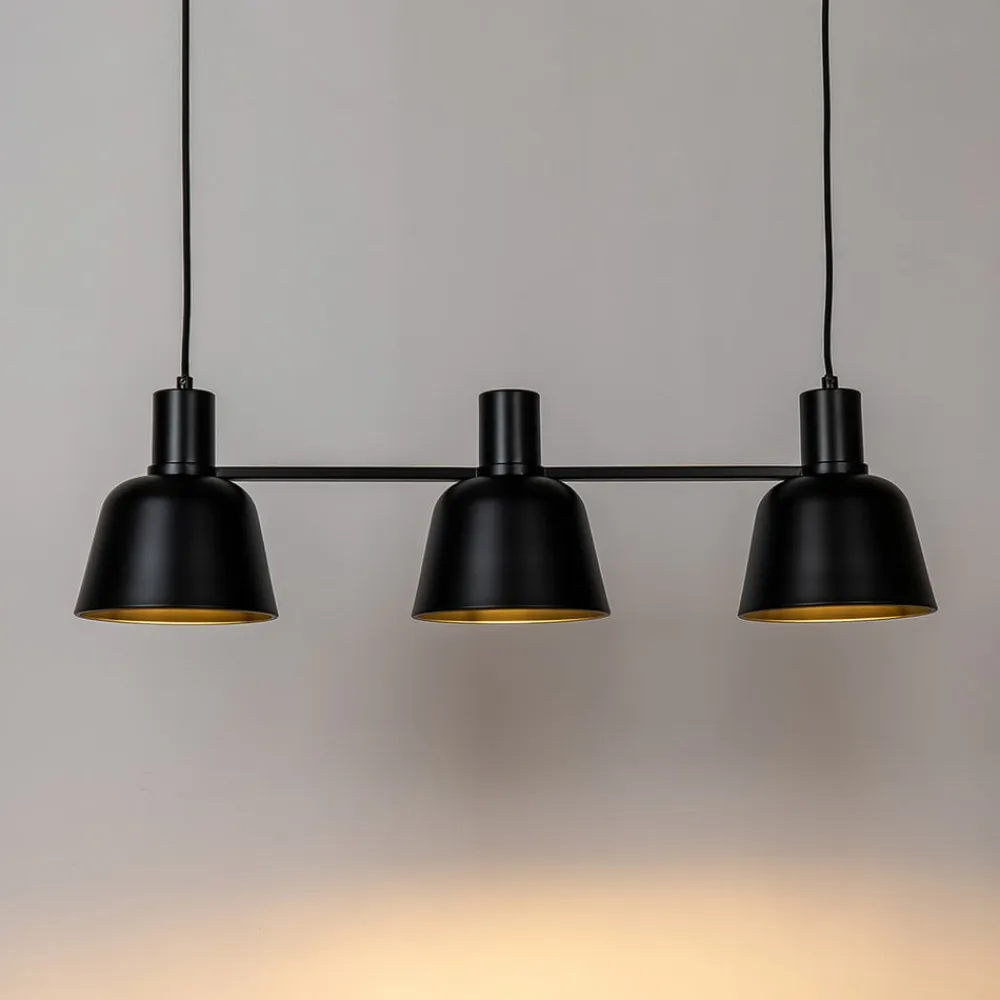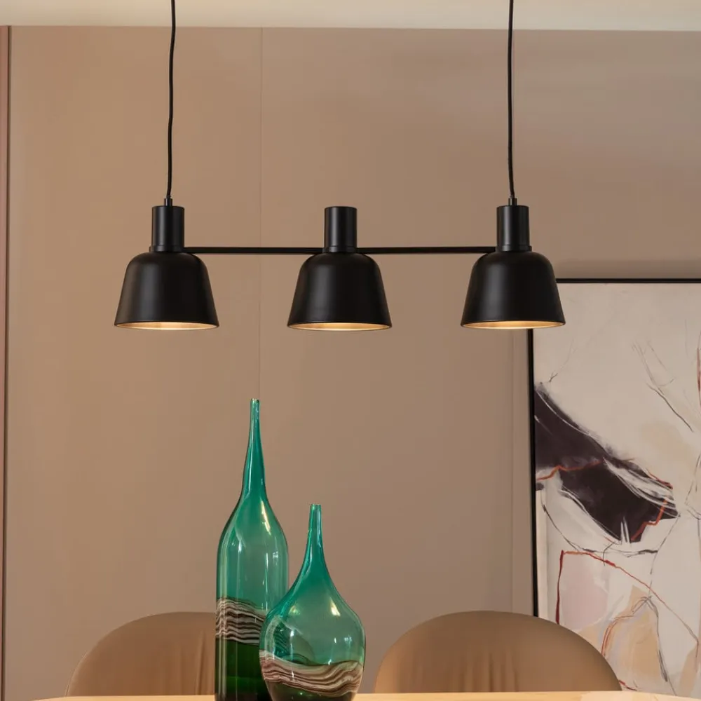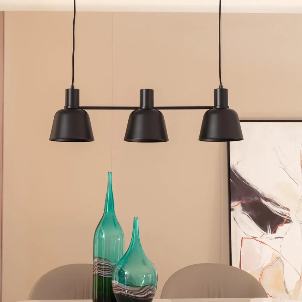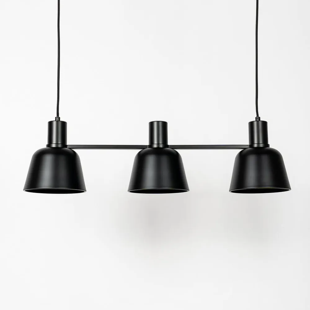 Matsort Servan pendellampe i bjælkeform med tre lampeskærme i designorienteret stil – perfekt til køkkener og spisestuer Servan-pendellampen er næsten udelukkende fremstillet af metal, nærmere bestemt jern, og er en fantastisk tilføjelse til en skandinavisk eller moderne indretningsstil. Armaturets design er eksklusivt og gennemtænkt på alle niveauer; du vil lede forgæves efter overflødige detaljer her. De tre lampeskærme, der er fastgjort til en bjælke, er sorte og takket være deres materiale så uigennemsigtige, at lyset udelukkende rettes nedad, hvor det optimalt kan belyse bord- eller diskoverflader.