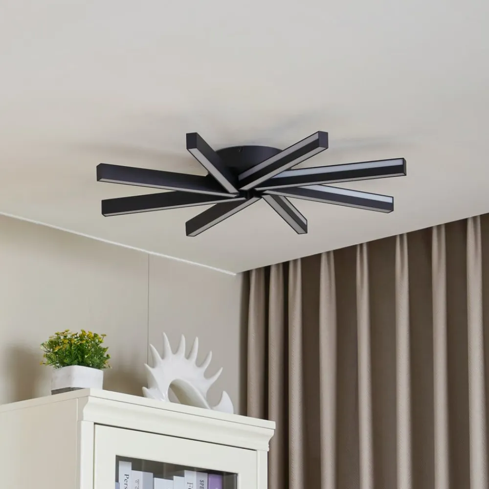 Tjado LED-loftlampe med otte lyslister – kan styres via fjernbetjening og Tuya Denne loftlampe gør en god figur i ethvert hjem. Lampen kan nemt tændes og slukkes ved hjælp af en fjernbetjening. Den har en farveskiftfunktion, der giver dig mulighed for at justere lysfarven efter dine individuelle behov. Loftlampen giver dig mulighed for at justere lysstyrken, så den passer til dine behov, ved hjælp af en fjernbetjening. Med sit stilfulde design er den en behagelig tilføjelse til belysningskonceptet i ethvert rum. Den sorte loftlampe imponerer med Lucande-mærkets kvalitet og står derfor for smagfuldt design og en unik boligoplevelse. Den vil sætte et flot præg på ethvert opholdsrum, uanset hvor den installeres. Loftlampens stilfulde design giver hvert rum en smuk flair, der nemt kan matche dine eksisterende dekorative elementer. Uanset om den er tændt eller slukket: denne lampe vil imponere – kan også styres via den gratis Tuya-app (tilgængelig til iOS og Android)