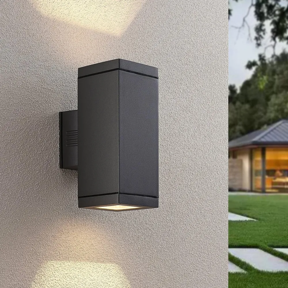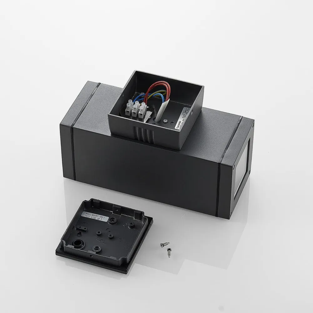 Stani passer til mange forskellige omgivelser, især dem, der inkorporerer en moderne stil. Den udendørs væglampe er fremstillet af et aluminiumslegeme med en mørkegrå overflade. På grund af E27-fatningerne kan du bruge to pærer efter egen smag, for nu til dags findes der adskillige varianter af pærer til denne standardfatning. Lyset afgives både på oversiden og nedad, så der skabes en behagelig kombination af direkte og indirekte lys, og en smal stribe foroven og forneden fuldender det moderne design.