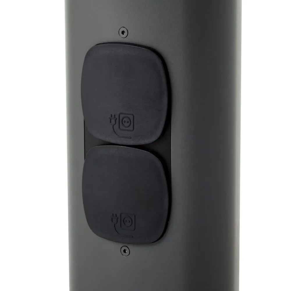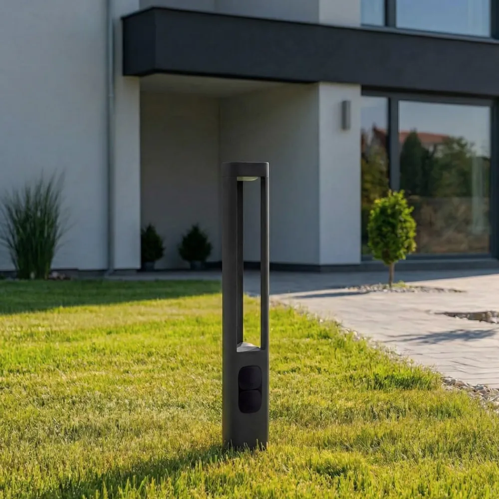Et særligt highlight ved denne vejlampe er den integrerede stikkontakt, der giver ekstra fleksibilitet, f.eks. til tilslutning af haveredskaber eller andre elektriske apparater. Den antracitfarvede overflade understreger lampens moderne karakter og passer harmonisk ind i forskellige udendørsområder som terrasser eller havegange.