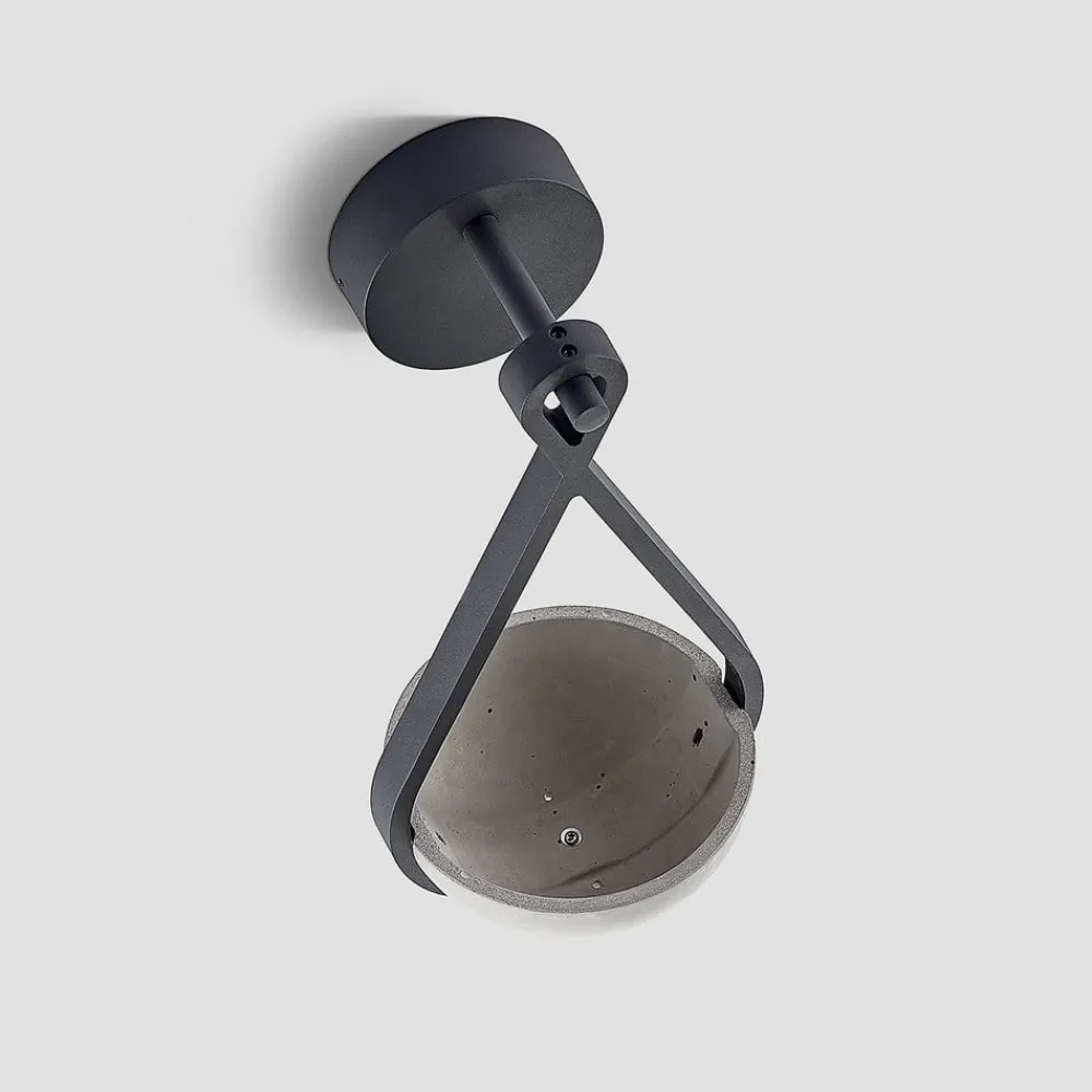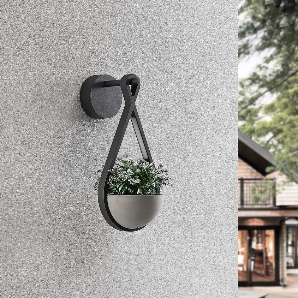 Landlig udendørs LED-væglampe Florka med integreret plantekasse Den udendørs LED-væglampe Florka imponerer over hele linjen med sit kreative design. Den mørkegrå ramme er lavet af holdbart aluminium. Den er kendetegnet ved naturlige, flydende former og indeholder to LED-moduler, der sender et behageligt, varmhvidt lys ned på planteskålen imellem sig. Takket være kapslingsgraden er Florka godt beskyttet mod vind og vejr og er derfor ideel til udendørs brug. Den naturlige patina, der dannes på betonskålen med tiden, er et karakteristisk træk ved beton og natursten. Denne misfarvning er ikke en defekt, men et tegn på naturlig ældning og giver armaturet en særlig æstetik. Hver lampe er derfor unik og passer harmonisk ind i dit have- eller terrassedesign