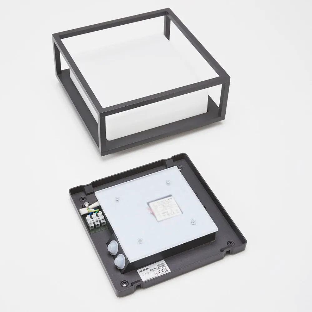 Den grafitfarvede ramme på den udendørs LED-væglampe Ilirian er fremstillet af trykstøbt aluminium og omslutter den firkantede lampeskærm som en slags ramme. Materialet er bevidst valgt for at gøre lampen robust og holdbar. Desuden er den godt beskyttet mod vejrliget takket være sin kapslingsgrad IP54.