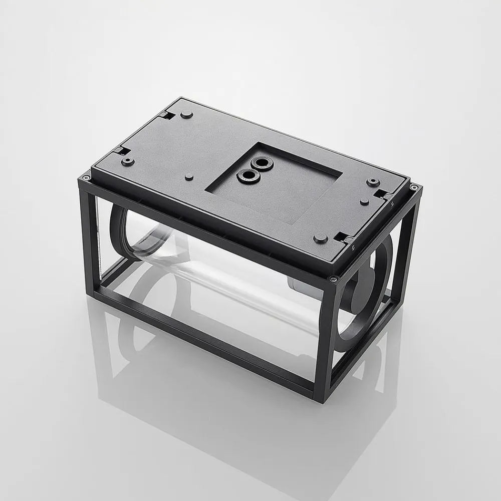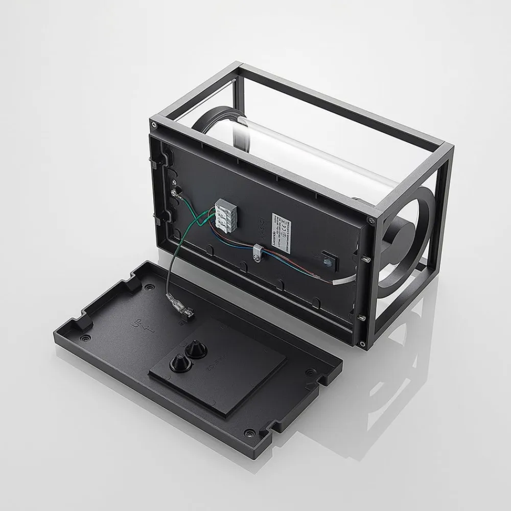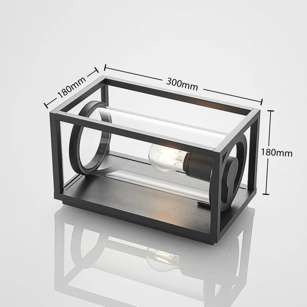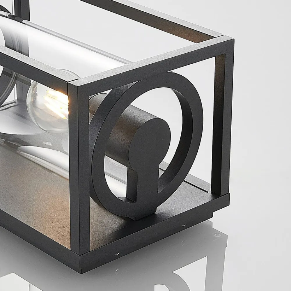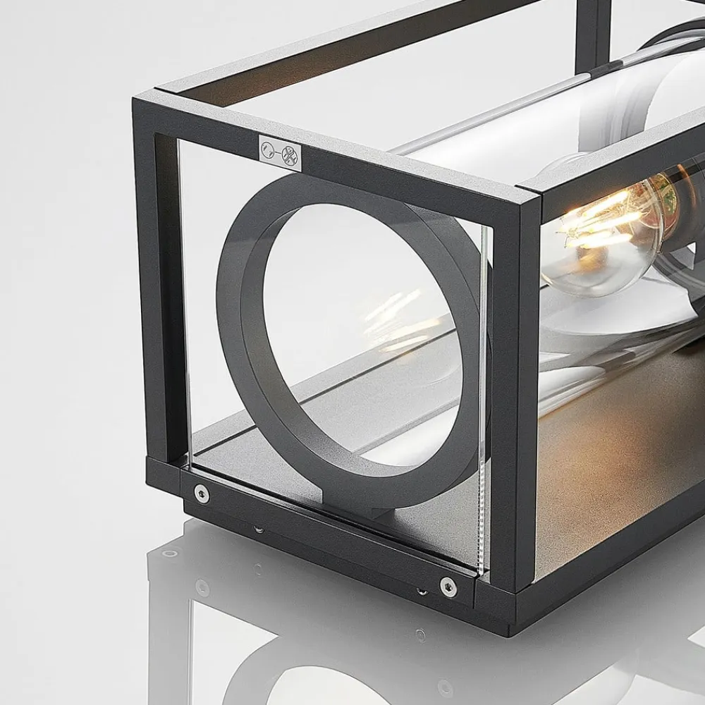 Rektangulær Brienne udendørs væglampe af aluminium og glas Brienne udendørs væglampen består af to komponenter. Den ydre komponent er et rektangulært aluminiumshus i en mørkegrå farve. Den anden komponent er en glascylinder, der er placeret inde i huset. Cylinderen beskytter pæren mod alle vejrforhold og afrunder samtidig armaturets design. Egnede pærer omfatter dekorative filamentpærer, som understreger armaturets moderne udseende – til A60-lyskilder