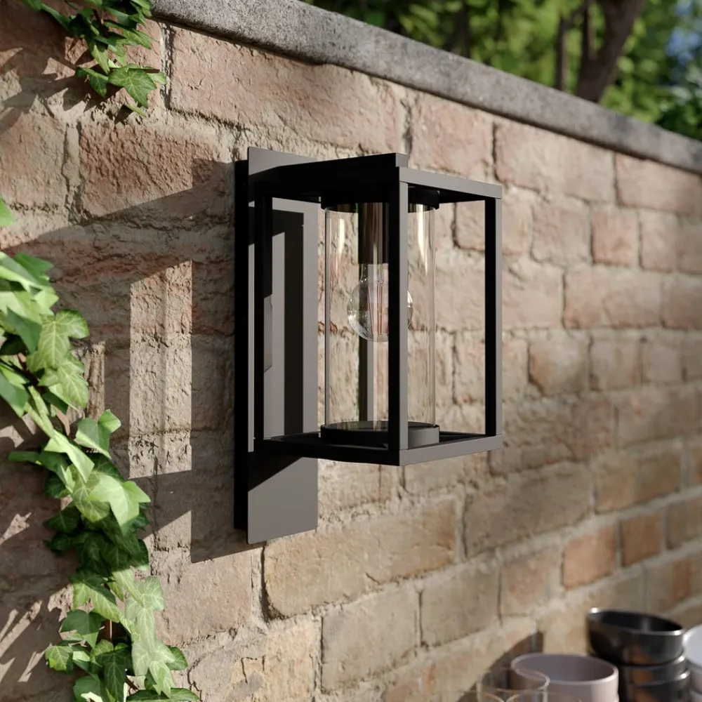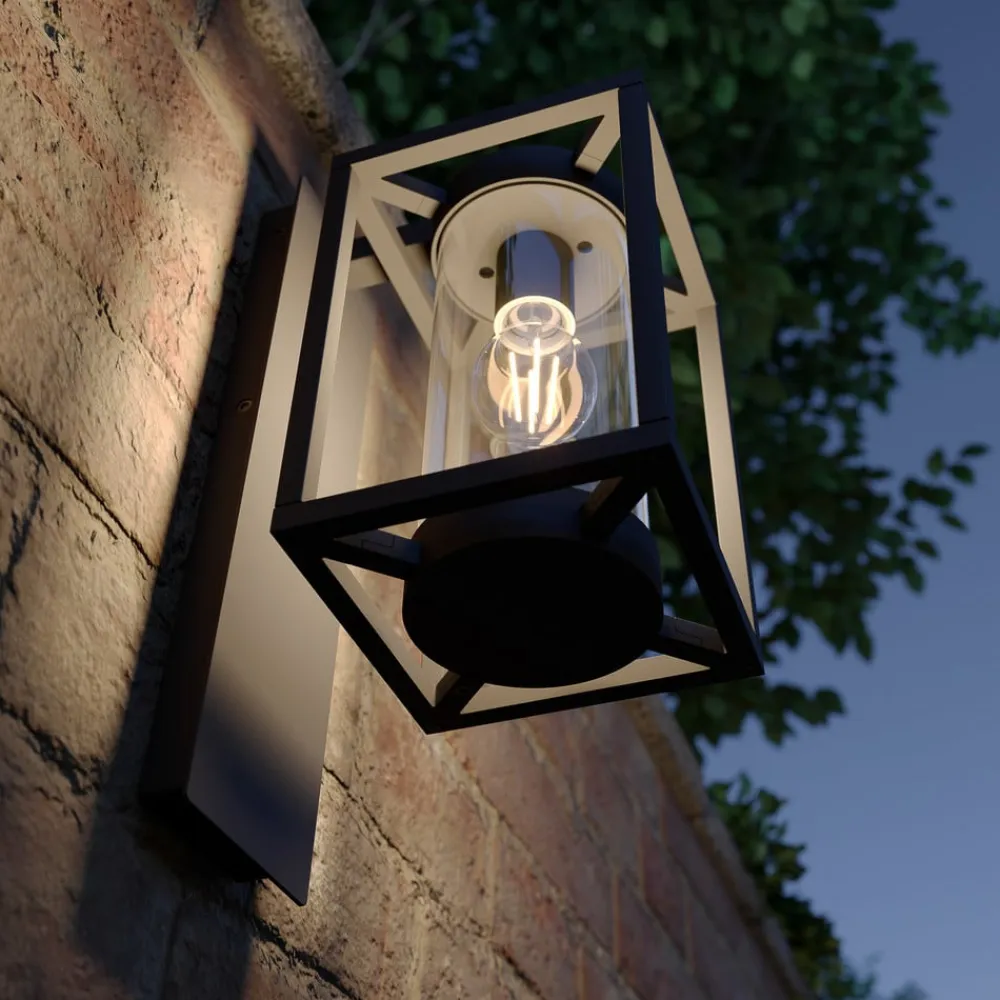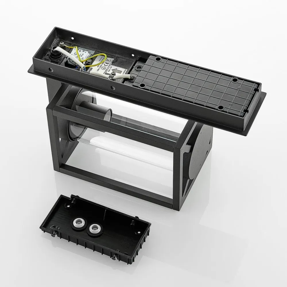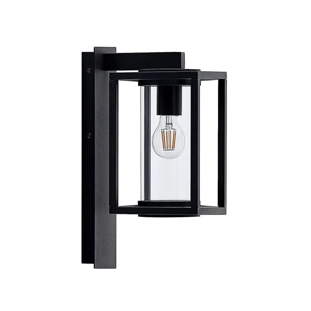 Ferda udendørs væglampe med glasdiffusor Den moderne Ferda udendørs væglampe er en stilfuld udendørslampe, der imponerer med sine geometriske former. Udendørslampens kantede hus er lavet af robust aluminium i antracit og giver frit udsyn til den cylindriske glasdiffusor. Den lyskilde, der skal bruges, er derfor tydeligt synlig og bør vælges med omhu, så den passer godt ind i det overordnede design. LED-filamentpærer er ideelle, både visuelt og med hensyn til teknologi.