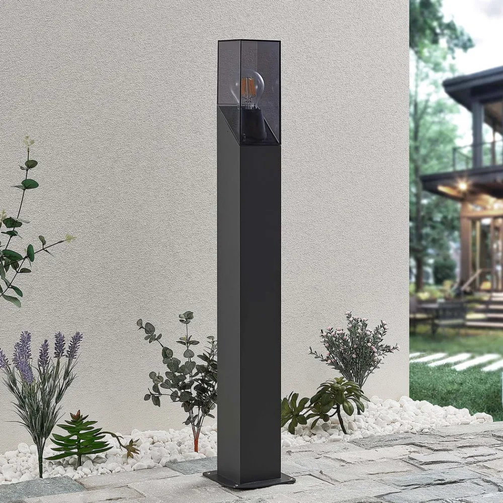 Attraktiv og moderne belysning til udendørsarealer – Fiola vejlampe Den moderne Fiola vejlampe er ideel til at give tilstrækkeligt lys langs havestier, indkørsler eller ved husets indgang i skumringen eller om natten. Det moderne look på dette attraktive armatur gør det ikke kun til en ideel ledsager rundt om huset efter mørkets frembrud, men imponerer også i dagslys. Den rektangulære krop på det mørkegrå aluminiumsarmatur er let skrånende i toppen og suppleres af en lys røggrå plastskærm. Den indvendige pære, som ikke er inkluderet i leveringsomfanget, er åben og synlig. Moderne filamentpærer eller retrofitpærer er derfor ideelle til brug i Fiola vejlampen.