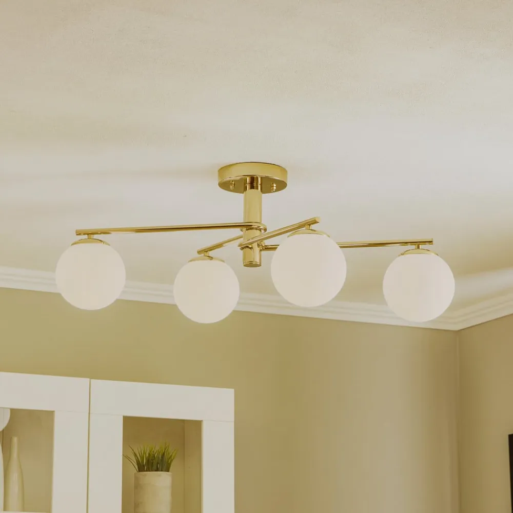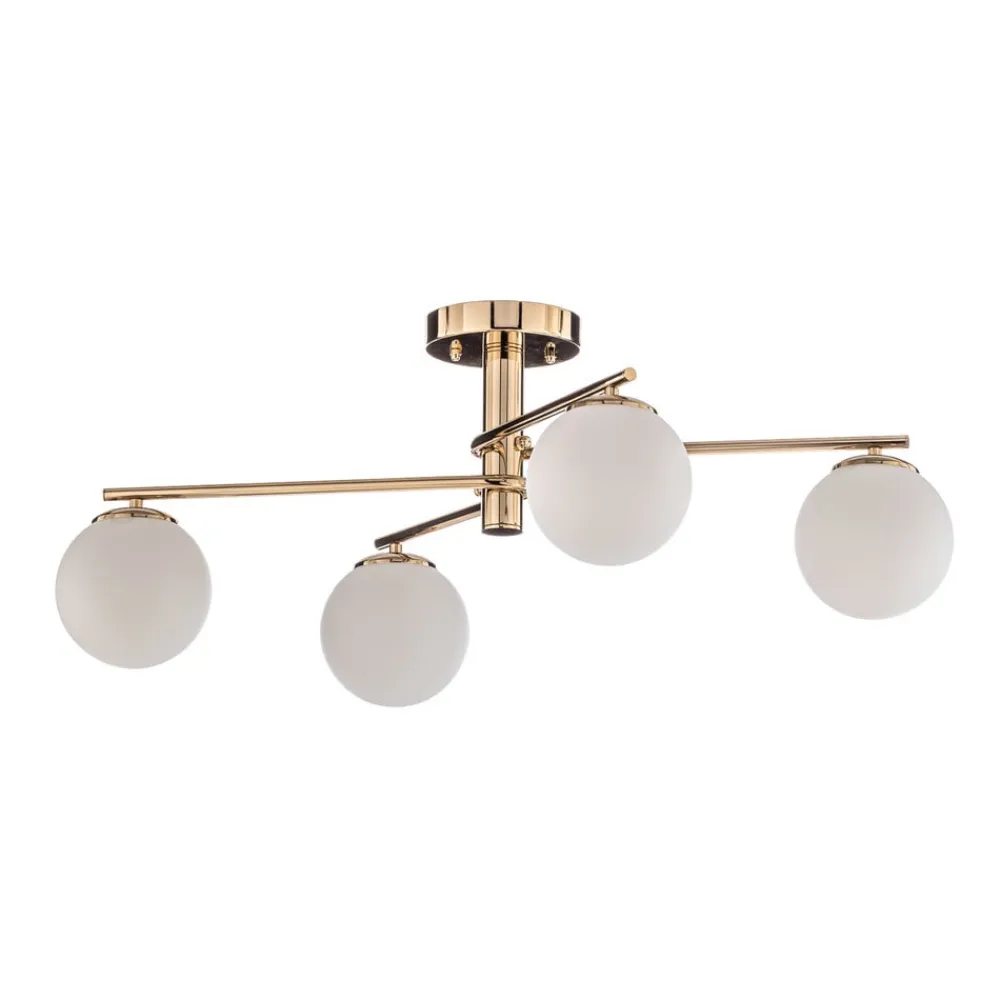 Loftlampen Bumerang, fremstillet af højkvalitets metal og glas, forener moderne design med funktionel belysning. Den gyldne og hvide farve giver ethvert rum et luksuriøst præg, mens konstruktionen med 4 lyskilder sikrer en jævn og effektiv belysning. Denne lampe er ideel til stuen, spisestuen, køkkenet og entreen og passer perfekt ind i forskellige indretningsstilarter og skaber en indbydende atmosfære.