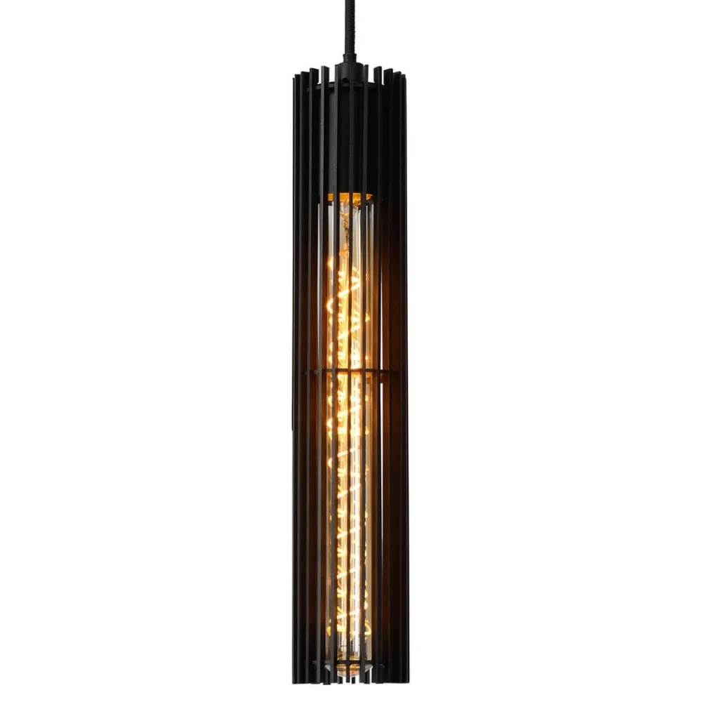 Lionel pendel i sort med åben skærm Lionel-pendlens udseende kan påvirkes af valget af lyskilde. Den lange skærm, som har et åbent design bestående af enkelte fine metalstivere, indeholder en E27-fatning, der skal monteres med en rørformet LED-pære (medfølger ikke). Afhængigt af valget af lyskilde kan man påvirke lysudstrålingen og armaturets udseende. Som vist ser en lampe med roterede LED’er arrangeret i filamentteknologi smukkest ud.