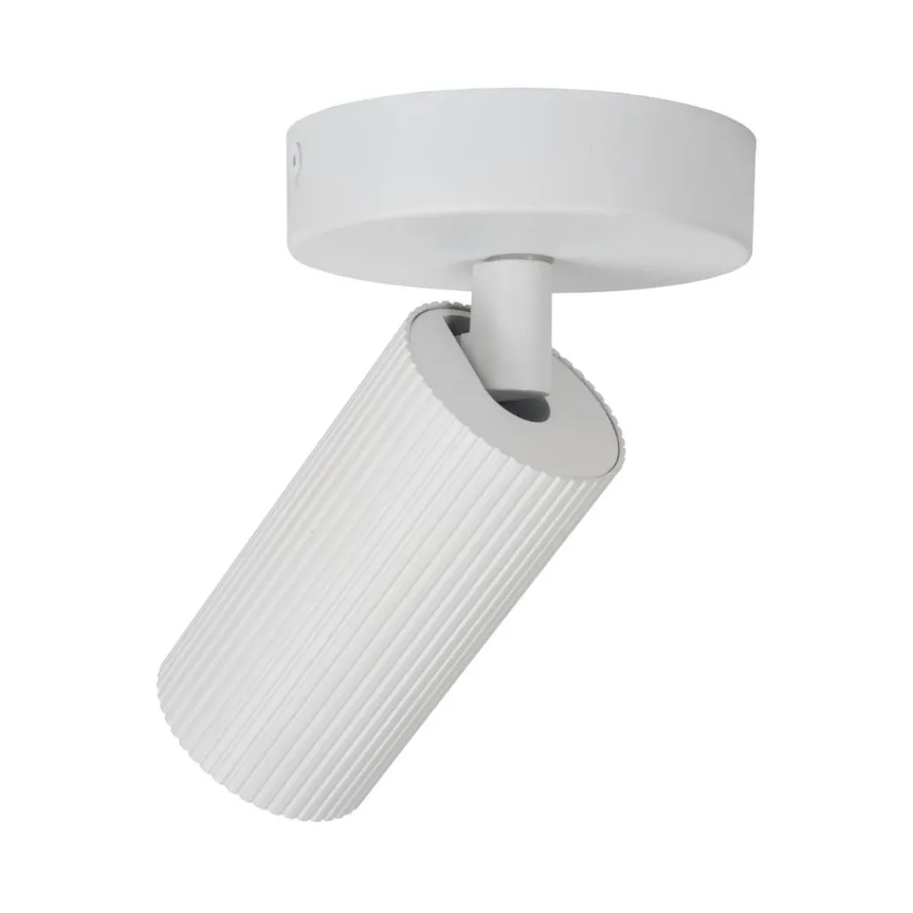 Clubs loftspot med én lampe og justerbar spotClubs er en diskret, minimalistisk loftspot helt i hvidt. Spottet er cylindrisk formet og har fine riller i overfladestrukturen. Loftslampen er fremstillet udelukkende af aluminium, hvilket gør den robust og af høj kvalitet. Takket være leddet kan spottet nemt justeres for at sætte bevidste højdepunkter i rummet. På den måde kan udvalgte områder belyses direkte.