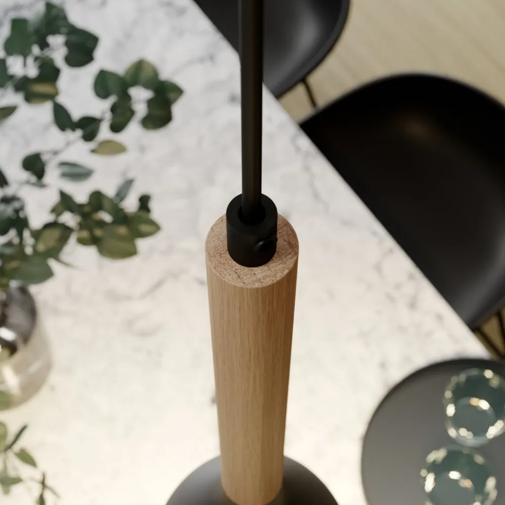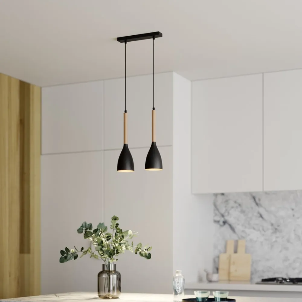 Hængelampen Muza kombinerer moderne design med naturlige materialer og skaber dermed en harmonisk atmosfære i ethvert rum. Kombinationen af sort metal og lyst træ giver lampen en tidløs elegance, der passer perfekt ind i forskellige indretningsstilarter. Med sin konstruktion med 2 lyskilder sikrer den optimal belysning i stuen, køkkenet eller spisestuen og sætter stilfulde accenter.