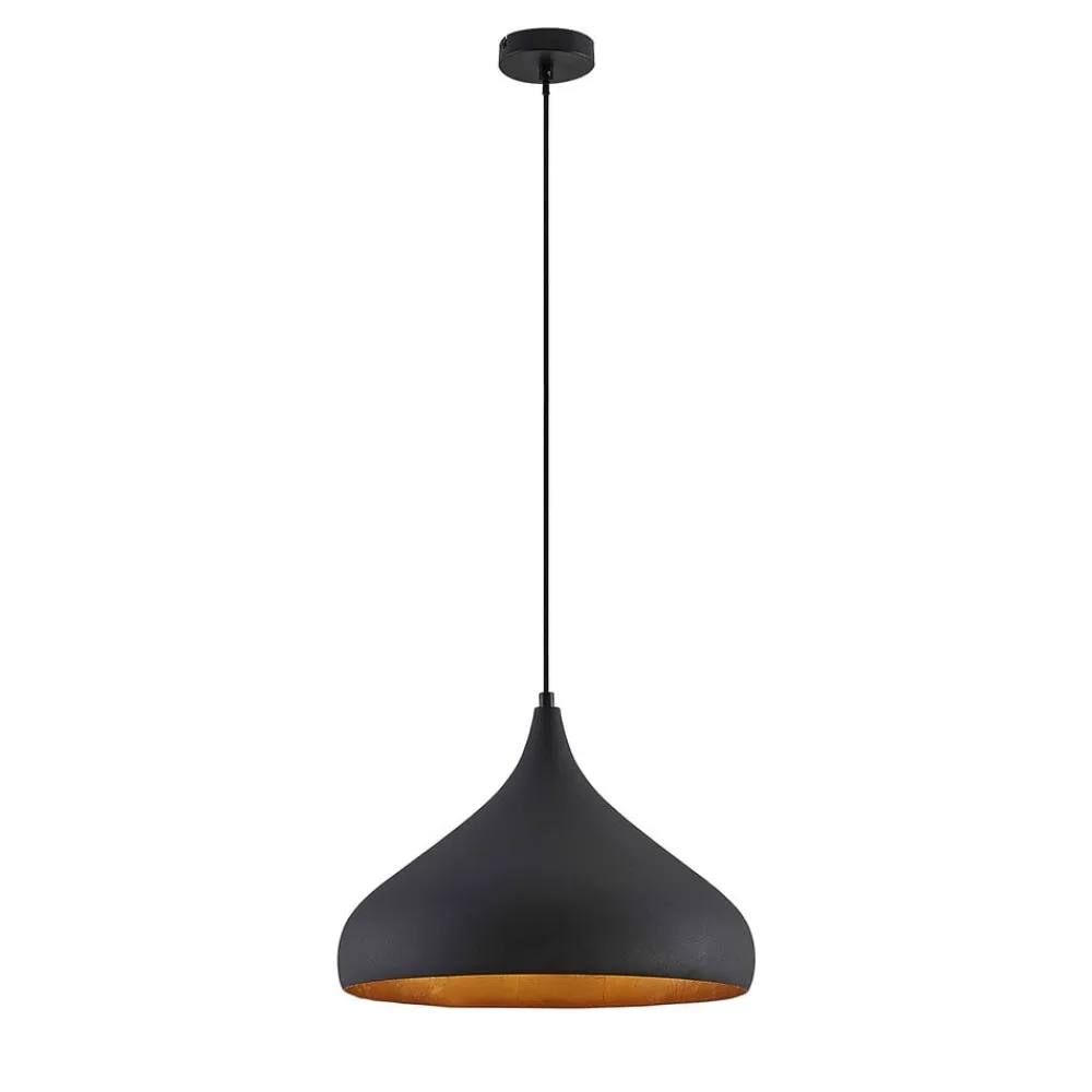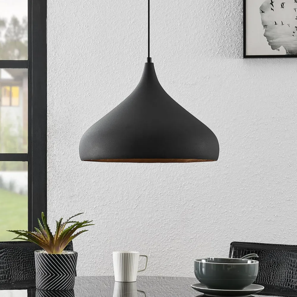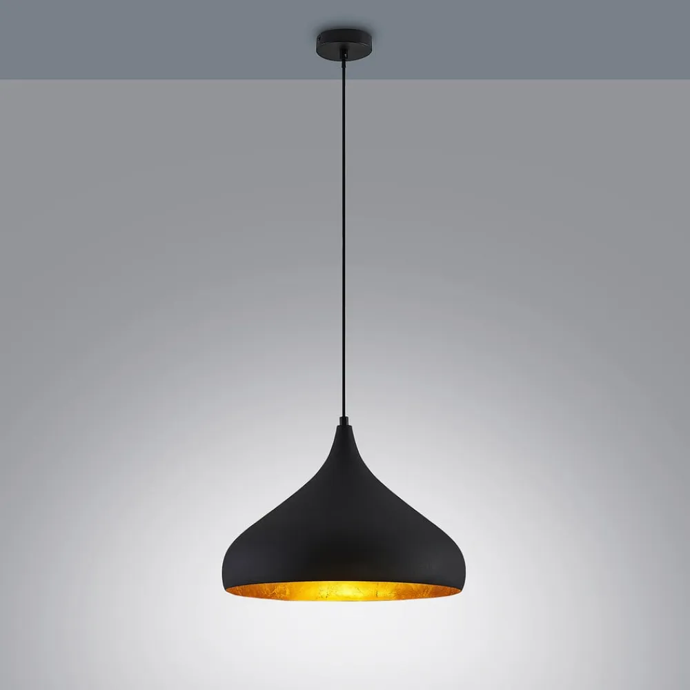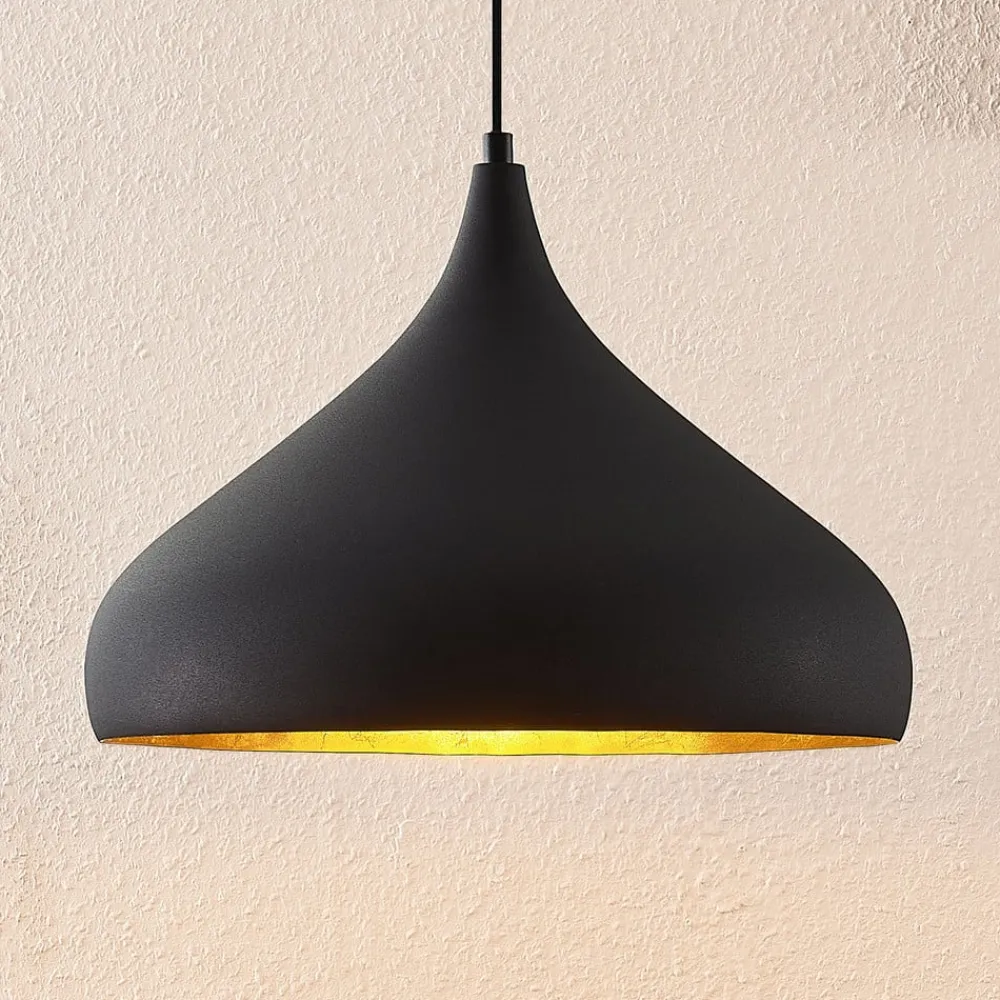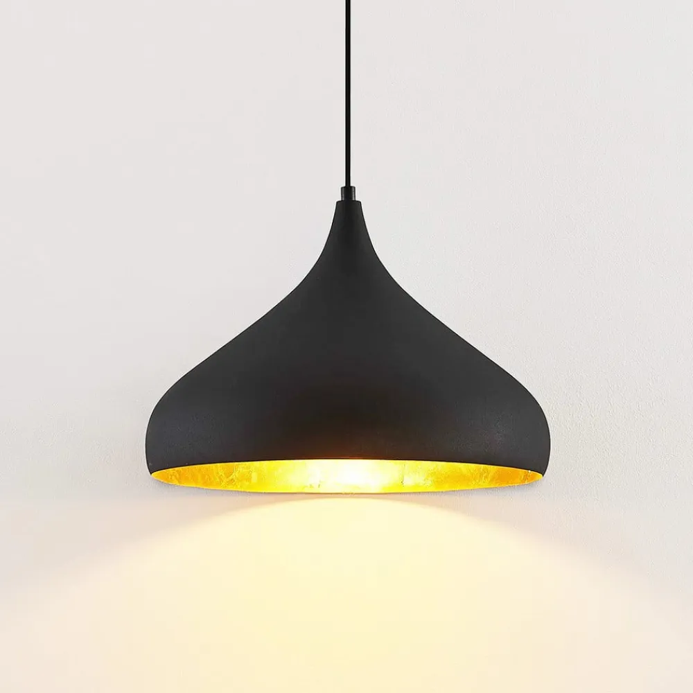 De moderne pendellampe Lunus imponerer med sin dråbeformet lampeskærm. Ydersiden af skyggen er mat sort, mens indersiden skinner i guld. De to farver supplerer hinanden for at skabe et harmonisk helhedsbillede. Takket være det sorte ydre kan Lunus integreres i mange miljøer. Guldet giver lampen det bestemt noget, men det påtvinger ikke sig selv. Lyset reflekterer guldet, så glødet får en varm guldfarve. Dette skaber en behagelig og hyggelig atmosfære. Lunus kan let placeres i en moderne stue eller over et bord.