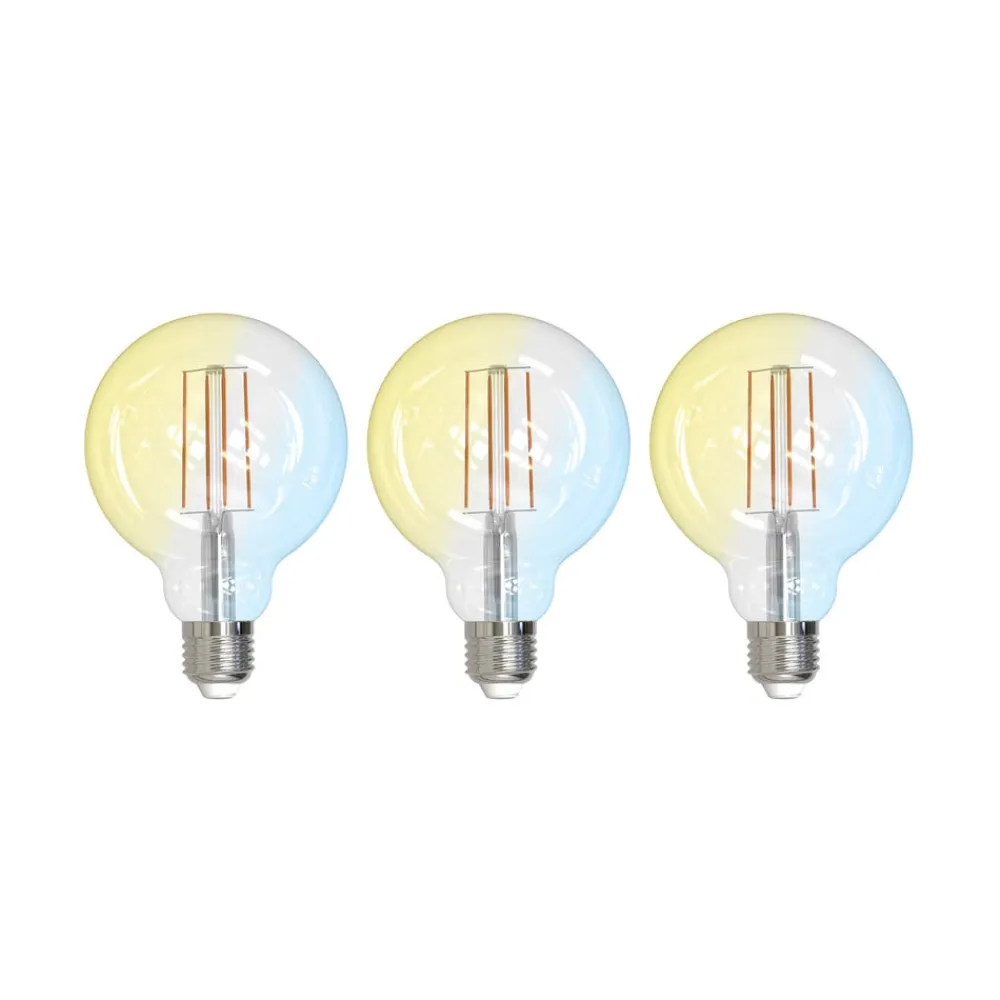 LED-filamentpære med E27-sokkel – kan styres via ZigBee, Tuya og Philips Hue Denne filamentpære passer til E27-fatninger og kan nemt styres med ZigBee, Tuya eller Philips Hue og integreres i et kompatibelt smart home-system. Den har en CCT-funktion og kan generere en lysfarve fra varmhvid (2.700 K) til dagslys (6.500 K) – Strålevinkel 320° – Dæmpbar – Leveres i et praktisk sæt med 3 Pærerne kan også styres ved hjælp af LUUMR APP. Den findes til både Android og Apple og kan nemt downloades på https://play.google.com/store/apps/details?id=luumr.app&hl=en_US eller https://apps.apple.com/de/app/luumr/id6470302637
