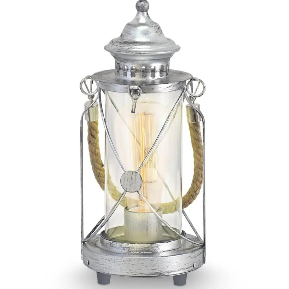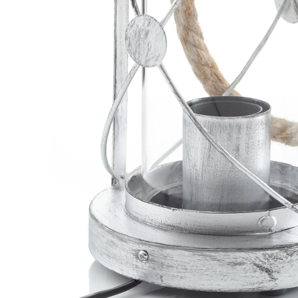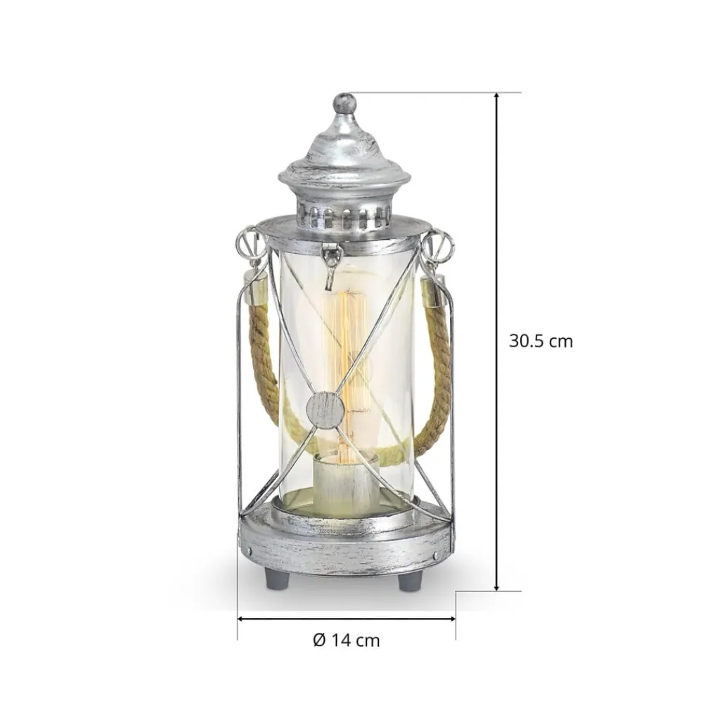 Lanterne bordlampen Kirian har et design i sølv antik, som minder om fortiden uden strøm. Glascylinderen er placeret i et stålstel og øverst befinder der sig et snoreophæng. Hvor der tidligere blev brugt stearinlys, sørger elektriske lyskilder i dag for en stemningsfuld stemning i rummet, som lader sig betjene via et snoretræk. Hvad end den er tændt eller slukket – lanterne bordlampen er et sandt blikfang.