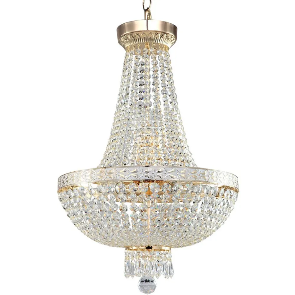 Bella lysekrone: strålende smuk belysning til en festlig atmosfæreMed denne fantastisk designede lysekrone ved man ikke, hvad man skal beundre først: metalrammen belagt med et varmt guld, det omgivende patinerede messingbånd med de fine ornamenter eller de utallige, forskelligt slebne krystaller i forskellige former og størrelser?Bella-lysekronen er et samlet kunstværk, der gør et storslået indtryk, når den ikke er tændt, men først udfolder sin festlige udstråling fuldt ud, så snart lyset tændes, og så både understreger metalforgyldningens varme glans og får krystallerne til at funkle intenst.