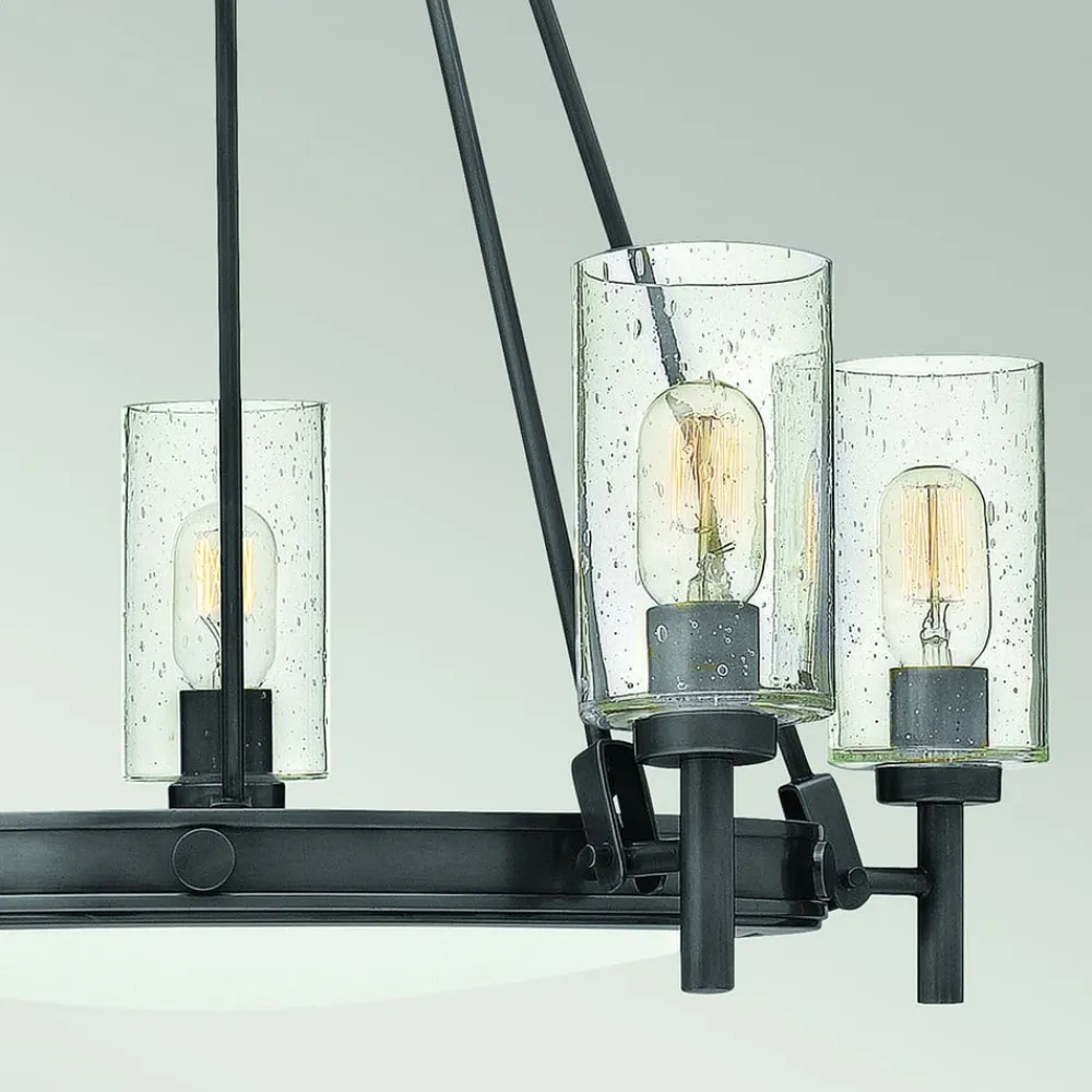 Den sorte finish på stålrammen og de cylindriske lampeskærme, der med deres uregelmæssigheder og luftbobler i glasset fremstår særligt dekorative og stilfulde, giver den 5-flammede lysekrone Collier et vidunderligt antikt og lige så elegant look, der kommer særligt godt til sin ret i stuer indrettet i antik stil. Lyset stråler ud i alle retninger gennem de cylinderformede, transparente lampeskærme, hvilket skaber en effektfuld belysning og et smukt lysbillede i rummet. I de transparente glas ser såkaldte vintage-pærer med glødetrådsteknik eller glødetrådslook særligt smukke ud.