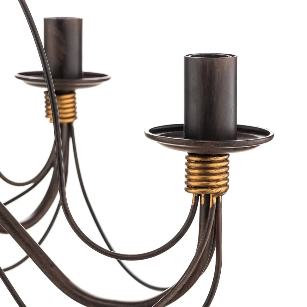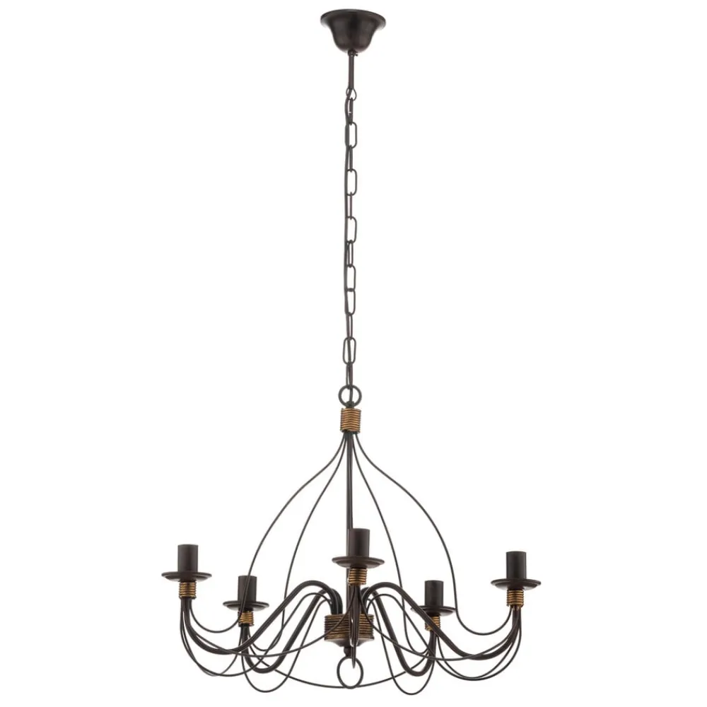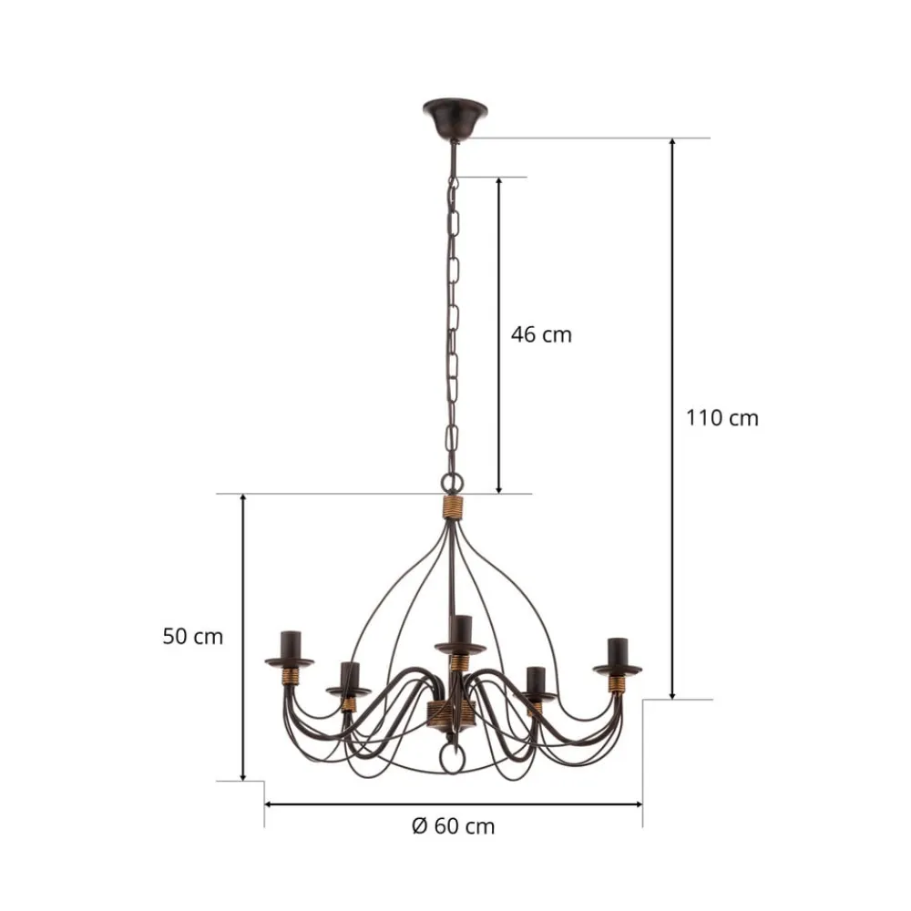 Lysekrone Fiamma Marrone 5 lyskilder uden skærme forener rustik charme med funktionel elegance. Fremstillet af robust jern og i en tiltalende mørkebrun og bronzefarve passer denne lysekrone perfekt ind i landlige og rustikke indretningsstilarter. Det åbne design uden skærme sikrer en direkte og effektfuld lysfordeling, der skaber en varm og indbydende atmosfære i stuer, spisestuer eller køkkener.