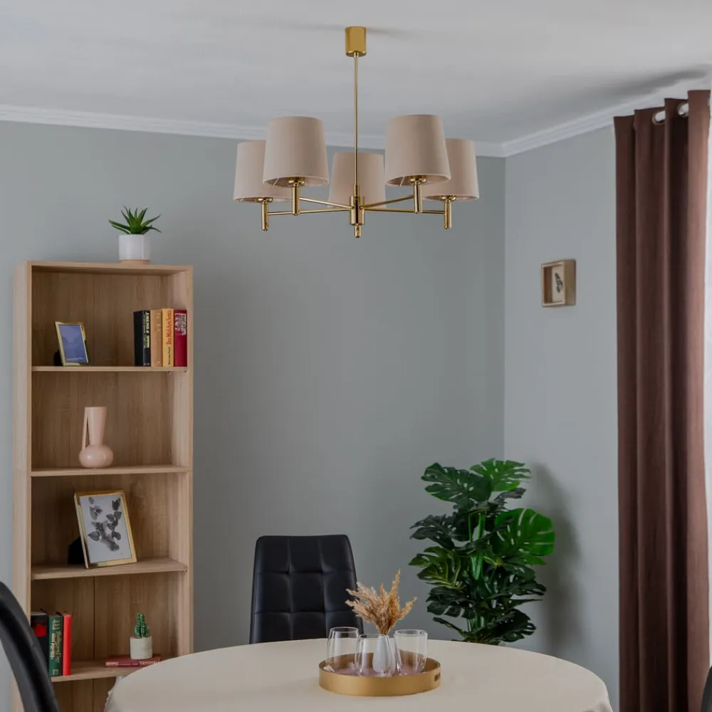 Lysekrone Polo, 5 lyskilder, beige/mørk messing, forener tidløs elegance med høj kvalitet. Dette mesterværk er fremstillet af eksklusivt velourstof og robust stål og passer perfekt ind i stuer og spisestuer. Den harmoniske farve i beige og mørk messing giver ethvert rum en varm og indbydende atmosfære.