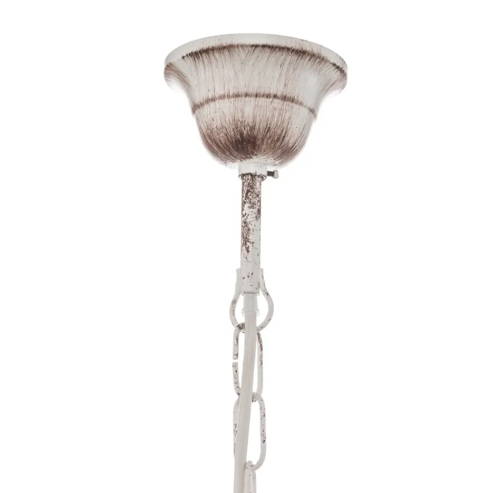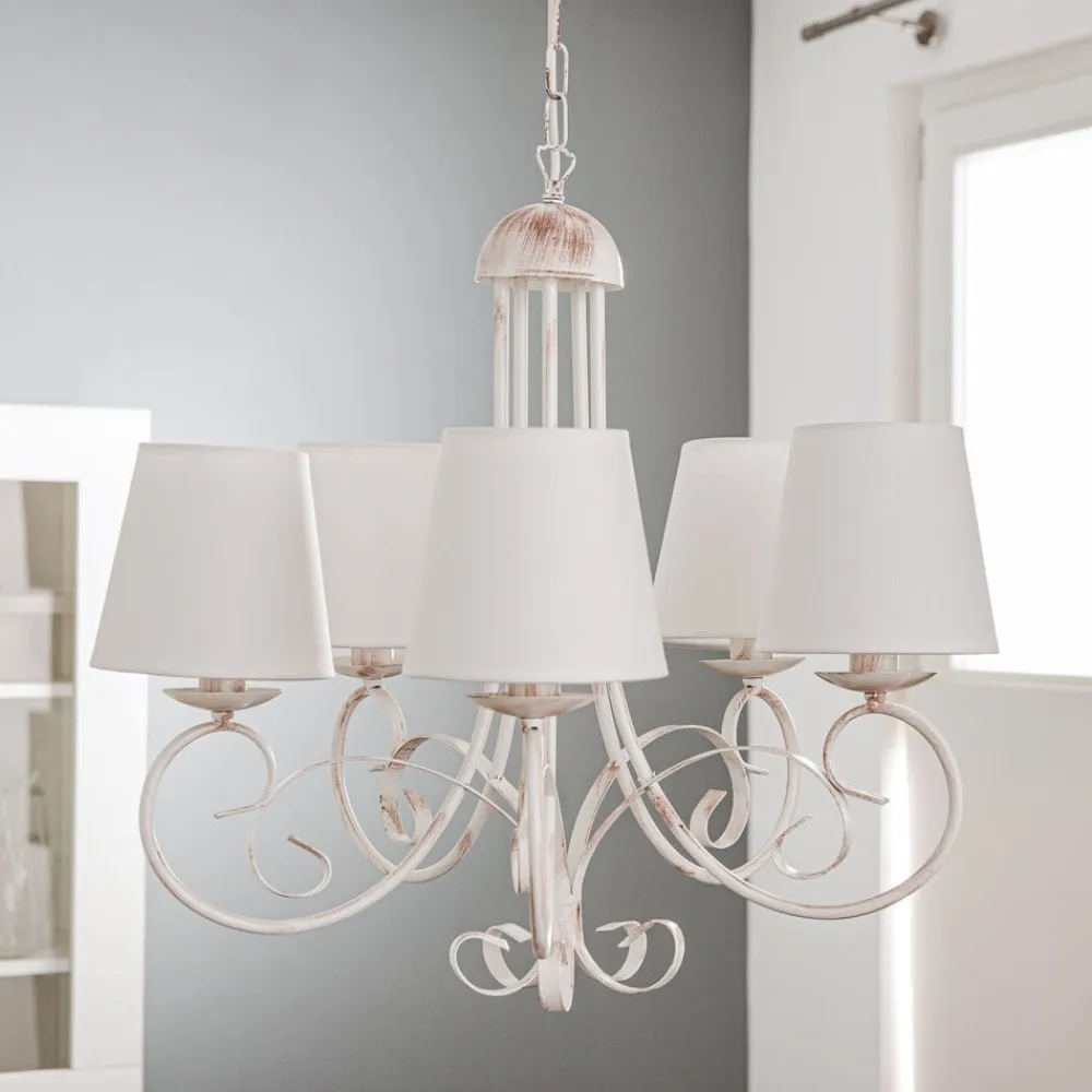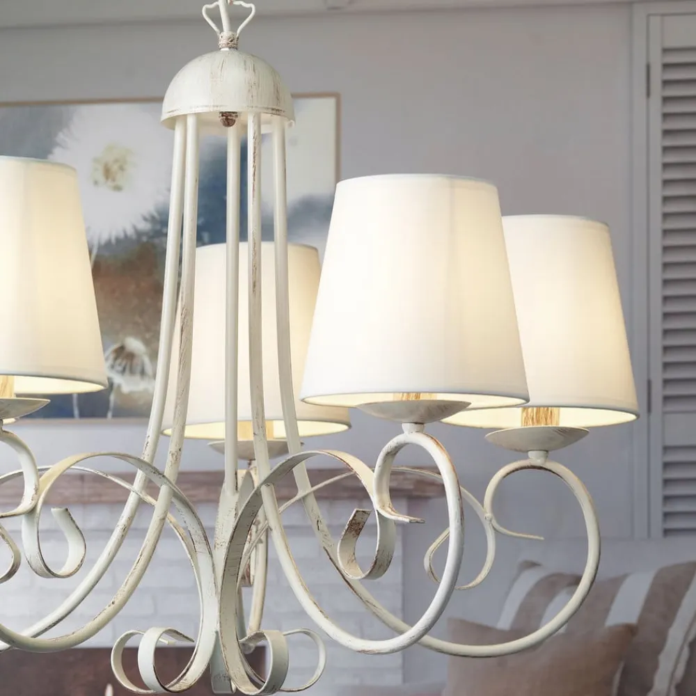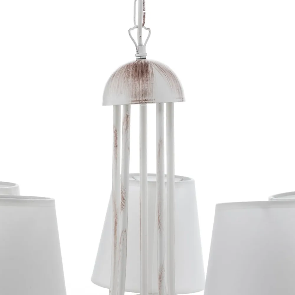 Lysekrone Pompei forener rustik charme med tidløs elegance og bliver et blikfang i enhver stue eller spisestue. Den er fremstillet af højkvalitets jern og forædlet med tekstilskærme og stråler i en tiltalende antik hvid farve. Denne kombination af materialer og farver giver rummet en varm og indbydende atmosfære, der passer til både traditionelle og moderne indretningsstilarter.