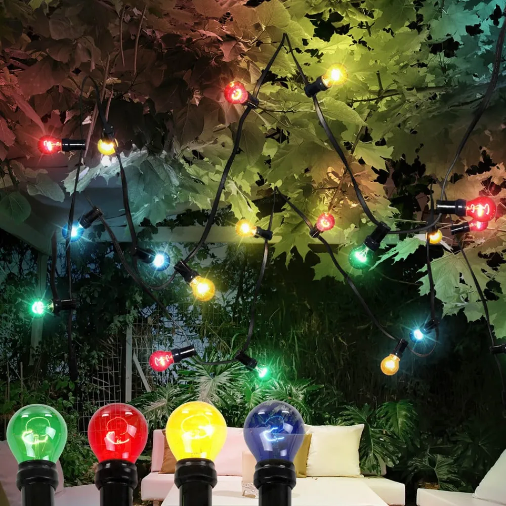 Nirvana lyskæder med 10 lyskilder til udendørs brug Nirvana lyskæder med farverige pærer (2 x blå, 3 x rød, 3 x gul og 2 x grøn) giver den helt rigtige belysning til en fest. Ti farverige glødepærer med E27-fatning pryder det sorte kabel. Nirvana er udstyret med stænkbeskyttelse (IP44) og kan derfor også bruges udendørs, f.eks. på altaner, terrasser eller i haver. Pærer medfølger.
