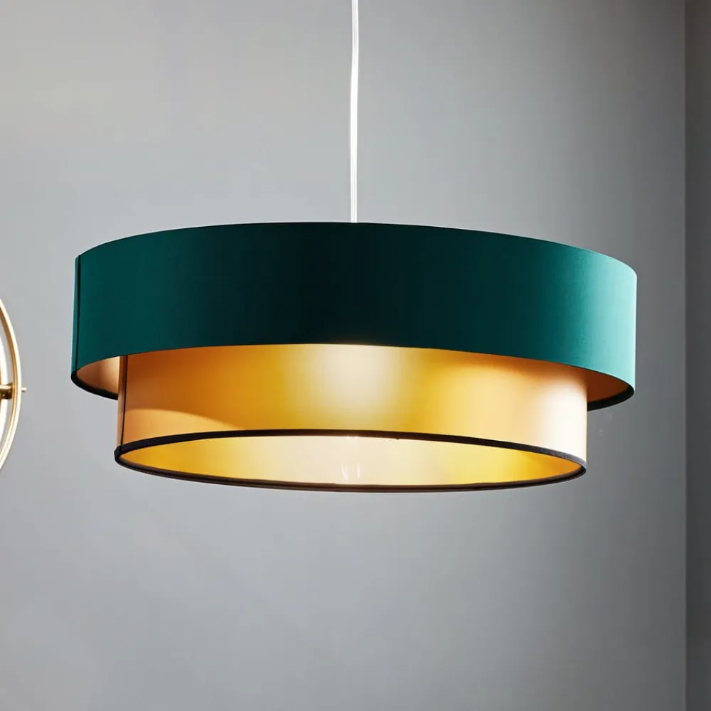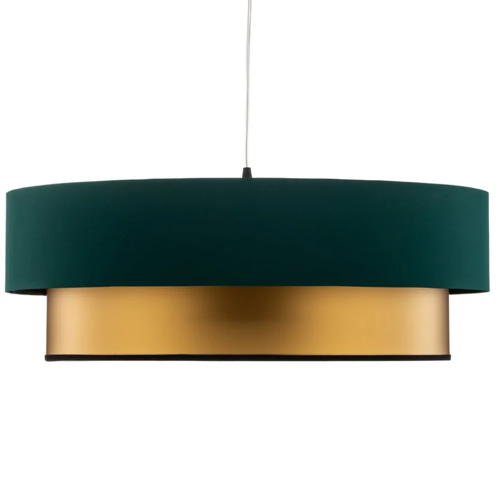 Hængelampen Dorina imponerer med sit unikke design med dobbelt skærm i en harmonisk kombination af grøn og guld. Denne lampe sætter stilfulde accenter og giver ethvert rum en særlig atmosfære. Den dobbelte skærm sikrer en jævn lysfordeling og skaber en behagelig atmosfære, der er velegnet til både afslappede aftener og produktive timer.