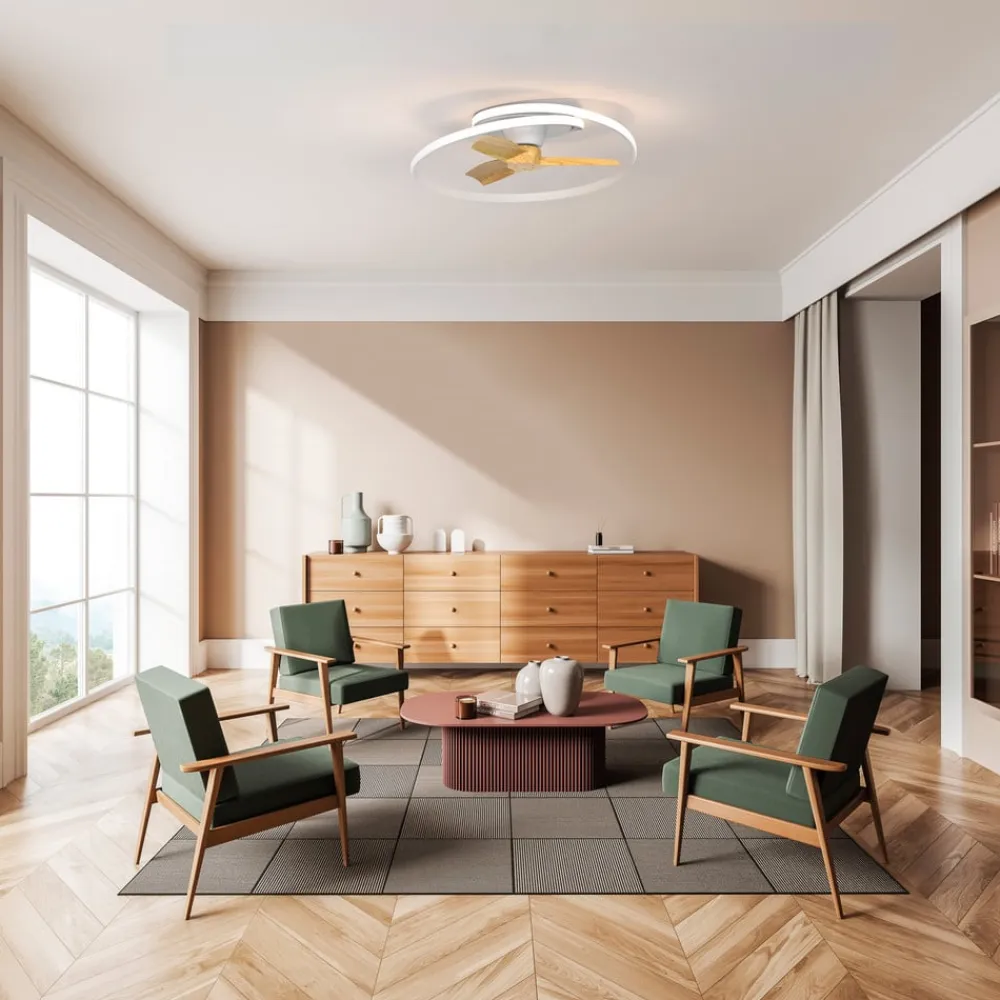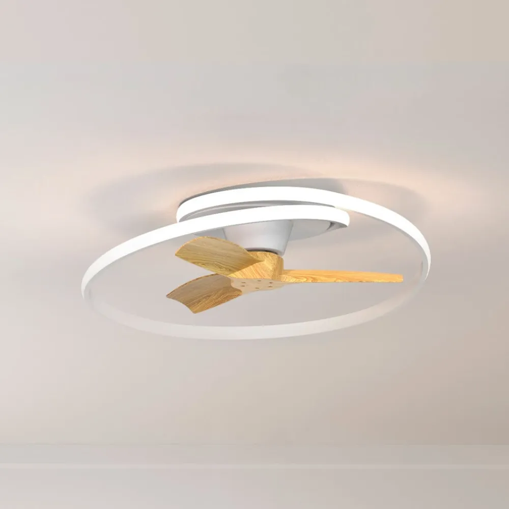 LED-loftventilatoren Ocean kombinerer en forfriskende brise med moderne almindelig belysning. De tre små vinger af plast sidder inden i en ringformet, buet krop. Sidstnævnte er på ydersiden udstyret med LED’er bag en satineret afskærmning. Lyset kan dæmpes, og farvetemperaturen kan reguleres. Betjeningen foregår med den medfølgende fjernbetjening.