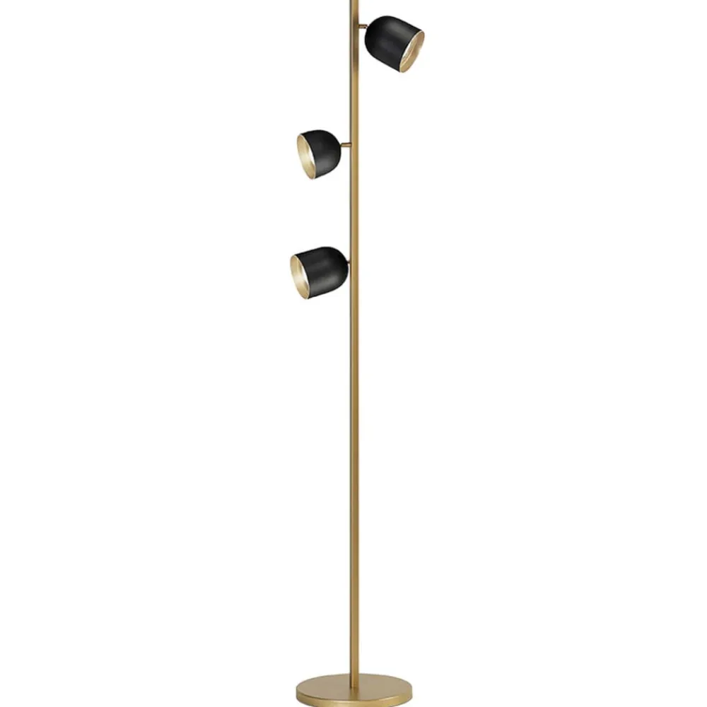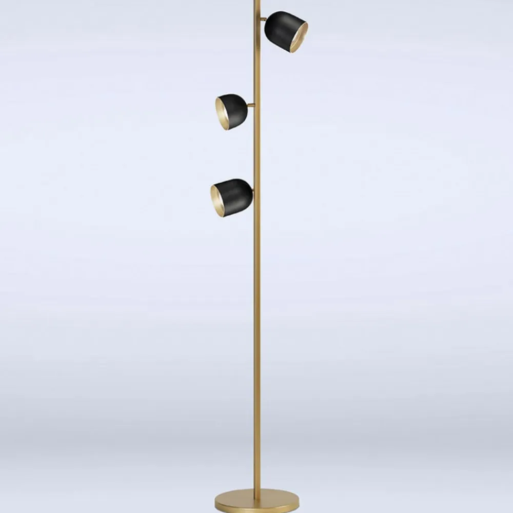 Imponerende Dome LED-gulvlampe med tre skærme Takket være sin størrelse er Dome LED-gulvlampen en iøjnefaldende lyskilde i moderne og sofistikerede opholds- og loungeområder. De kuppelformede skærme i forskellige størrelser er forskudt i den øverste del af det firkantede stativ. Da skærmene kan drejes og svinges og også har optiske linser, kan lysudbyttet styres efter behov. Den dominerende gyldne finish sikrer et elegant look i høj kvalitet.