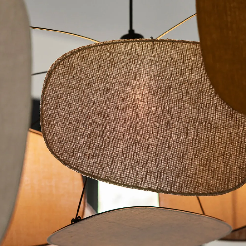 Denne ekstraordinære pendellampe fra det franske designmærke MARKET SET forener individualitet og harmoni i perfektion. Den centrale fatning er omgivet af flere linnedpaneler i rolige jordfarver, der er monteret i forskellige retninger og afstande. Stoffet er let gennemskinneligt og skaber et spil af lys og skygge, der ændrer sig med hver ny vinkel. Baldakin og metalstrukturen samt det tekstilbeklædte kabel er holdt i sort.