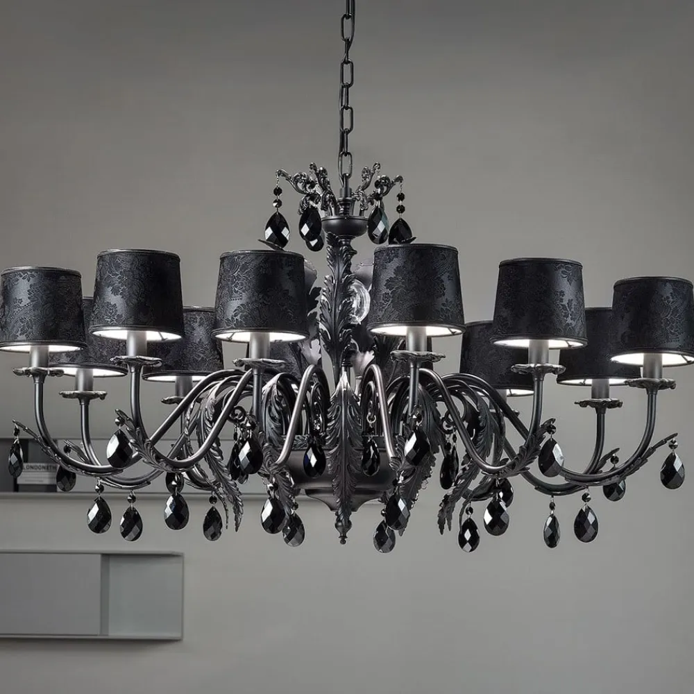 Med Asfour-krystaller og fornemme damaskskærme – sort lysekrone Angelis
