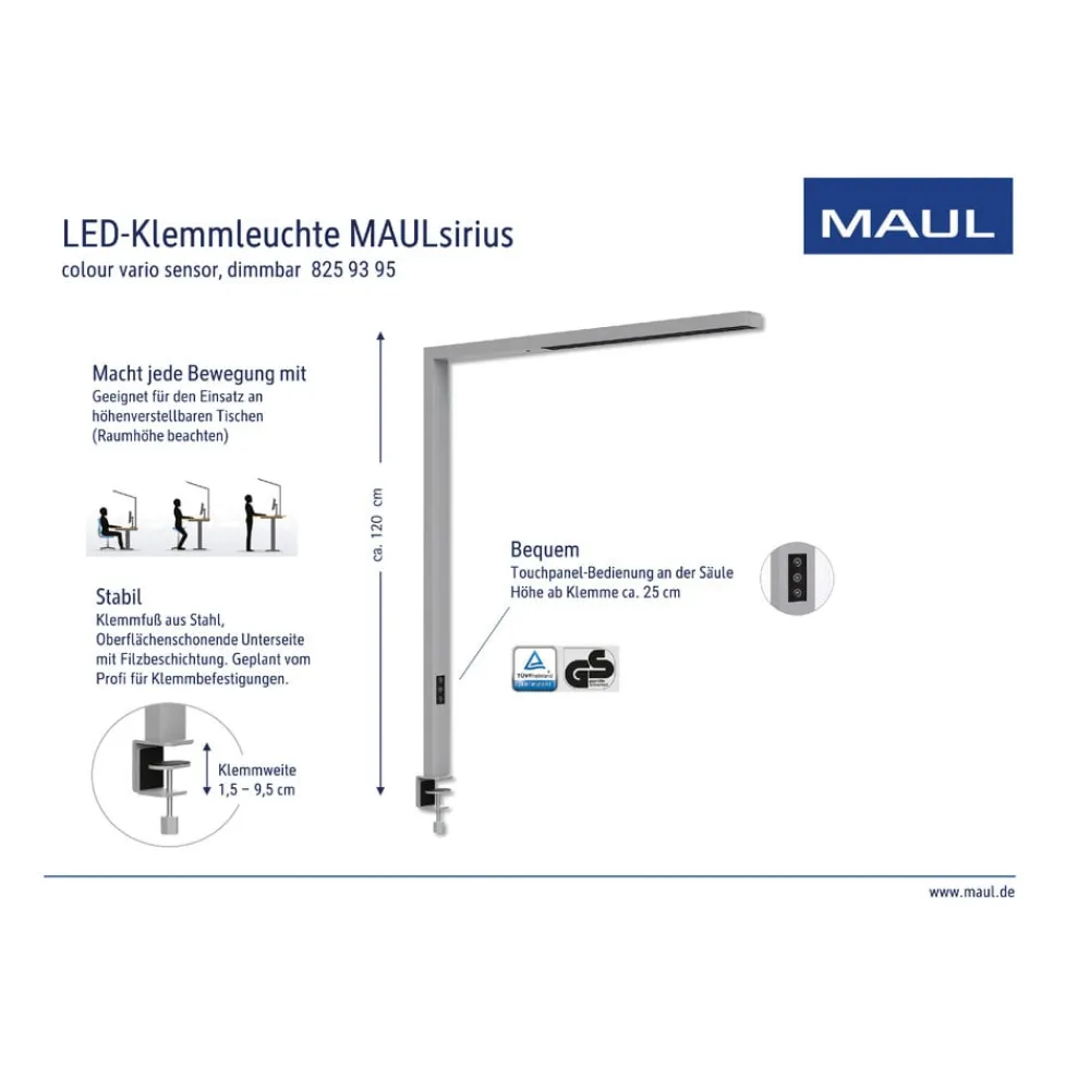 Ideel til højdejusterbare skriveborde: MAULsirius LED-klemmelampe med bevægelses- og dagslyssensor – justerbar lysfarve og lysstyrke MAULsirius LED-klemmelampen sættes nemt fast på bordpladen. Den udsender både direkte (30 %) og indirekte lys (70 %). Den ideelle belysningsløsning til højdejusterbare skriveborde. Fastspændingsområdet er 1,5 cm til 9,5 cm. En bevægelsessensor og en dagslyssensor er integreret i MAULsirius, dvs. at lyset kun tændes, når der er brug for det. Dagslyssensoren styrer lysudbyttet og udsender kun så meget lys, som de naturlige lysforhold i rummet kræver. Efter 30 minutter uden bevægelsesregistrering dæmpes lyset først, og efter yderligere 30 minutter slukkes belysningen automatisk. Lyset styres via betjeningspanelet, som er placeret ca. 25 cm over bordklemmen – trinløst dæmpbar – trinløst justerbar farvetemperatur – med diffuser for lav skyggevirkning – lysfordeling: indirekte 70 % og direkte 30 % – belysningsstyrke i bunden: 2020 lux / 110 cm, 3360 lux / 85 cm