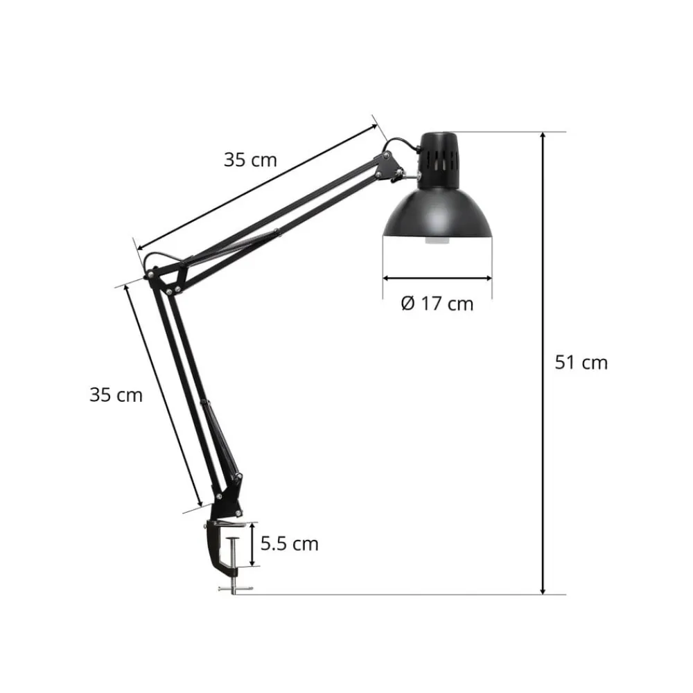 - Armlængde i bunden og toppen 35 cm hver, lampehoved – Ø 17 cm, fastspændingsbredde op til 5,5 cm